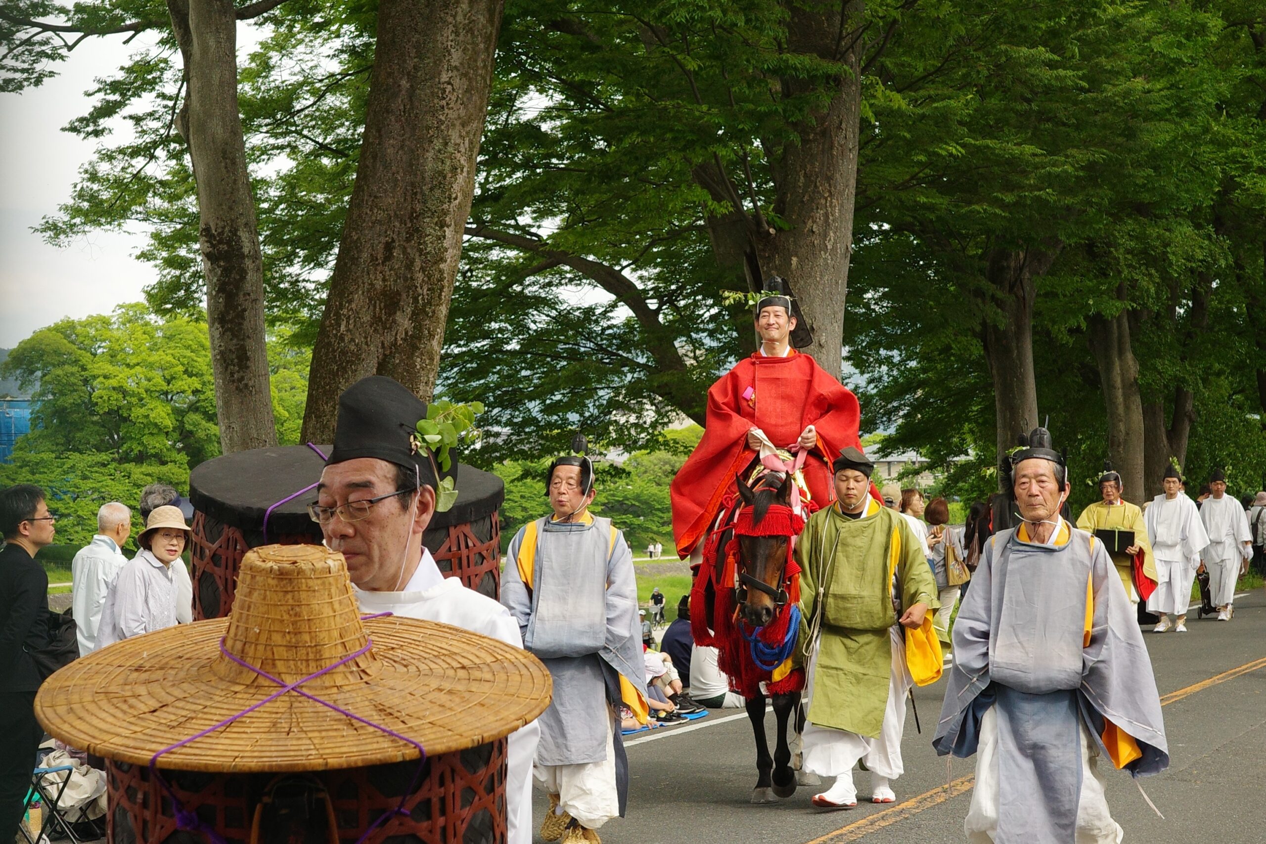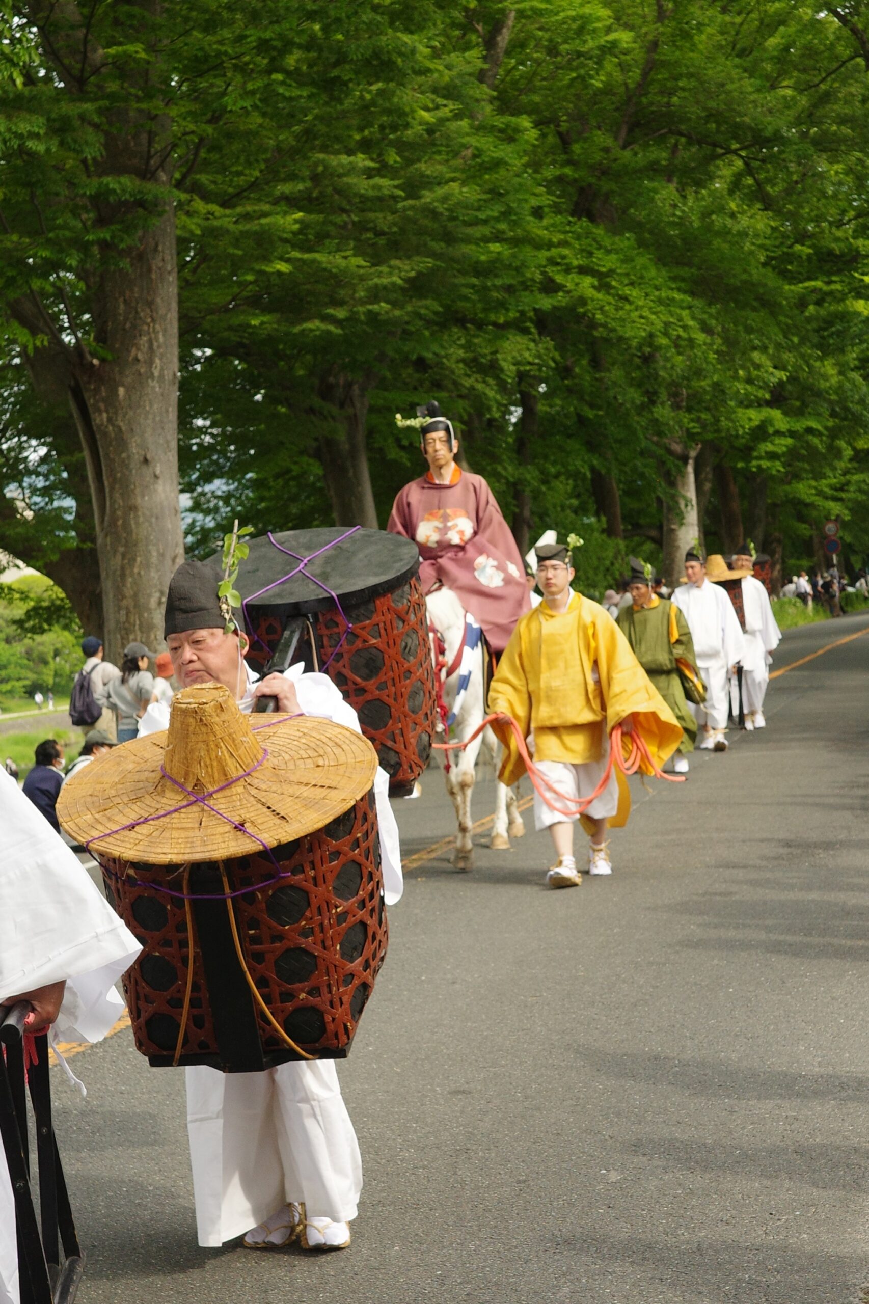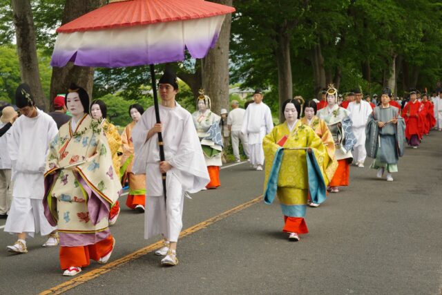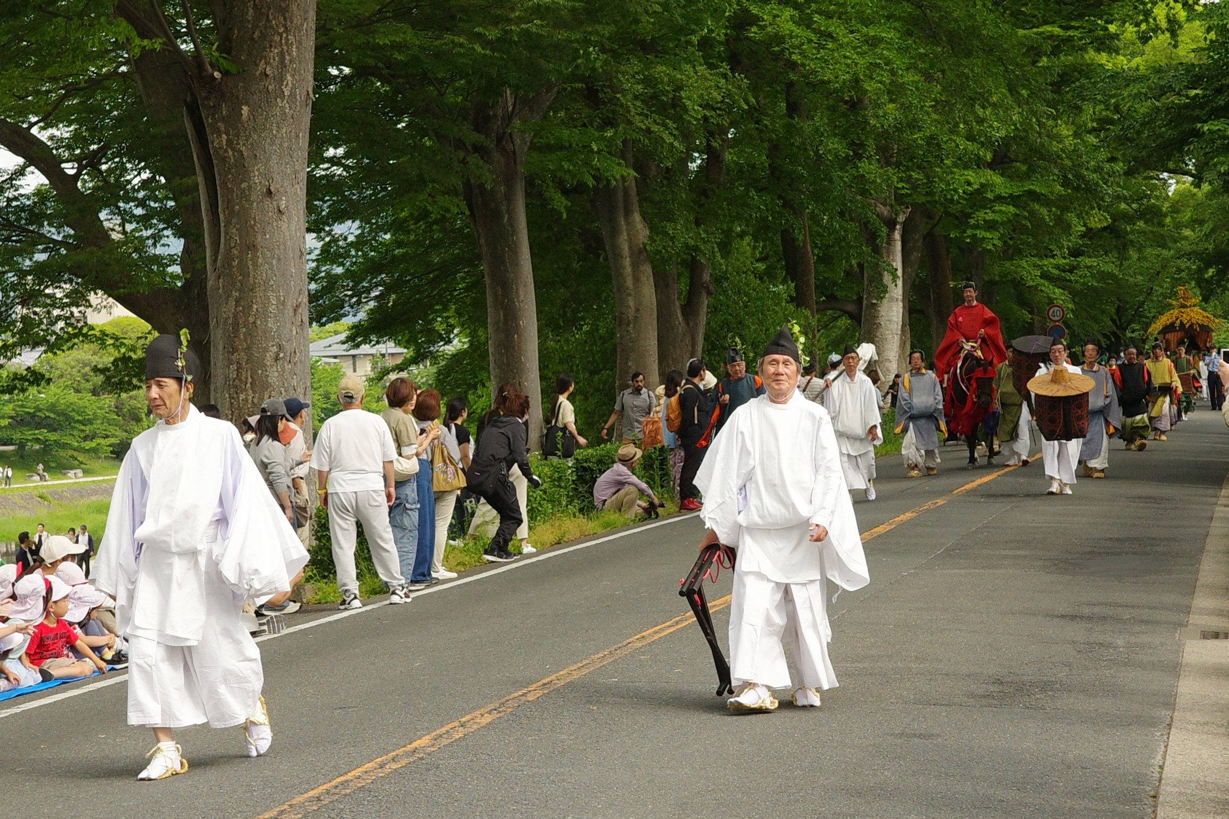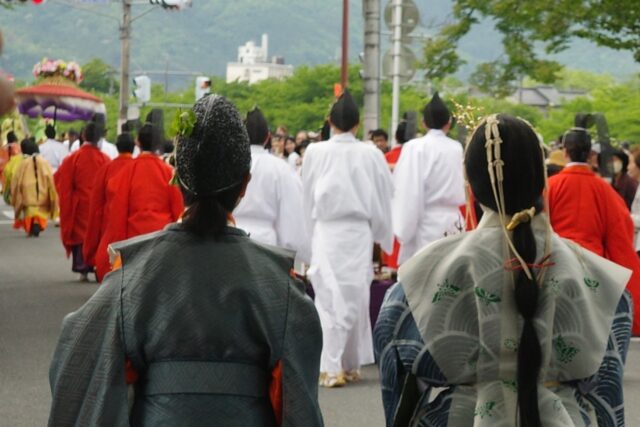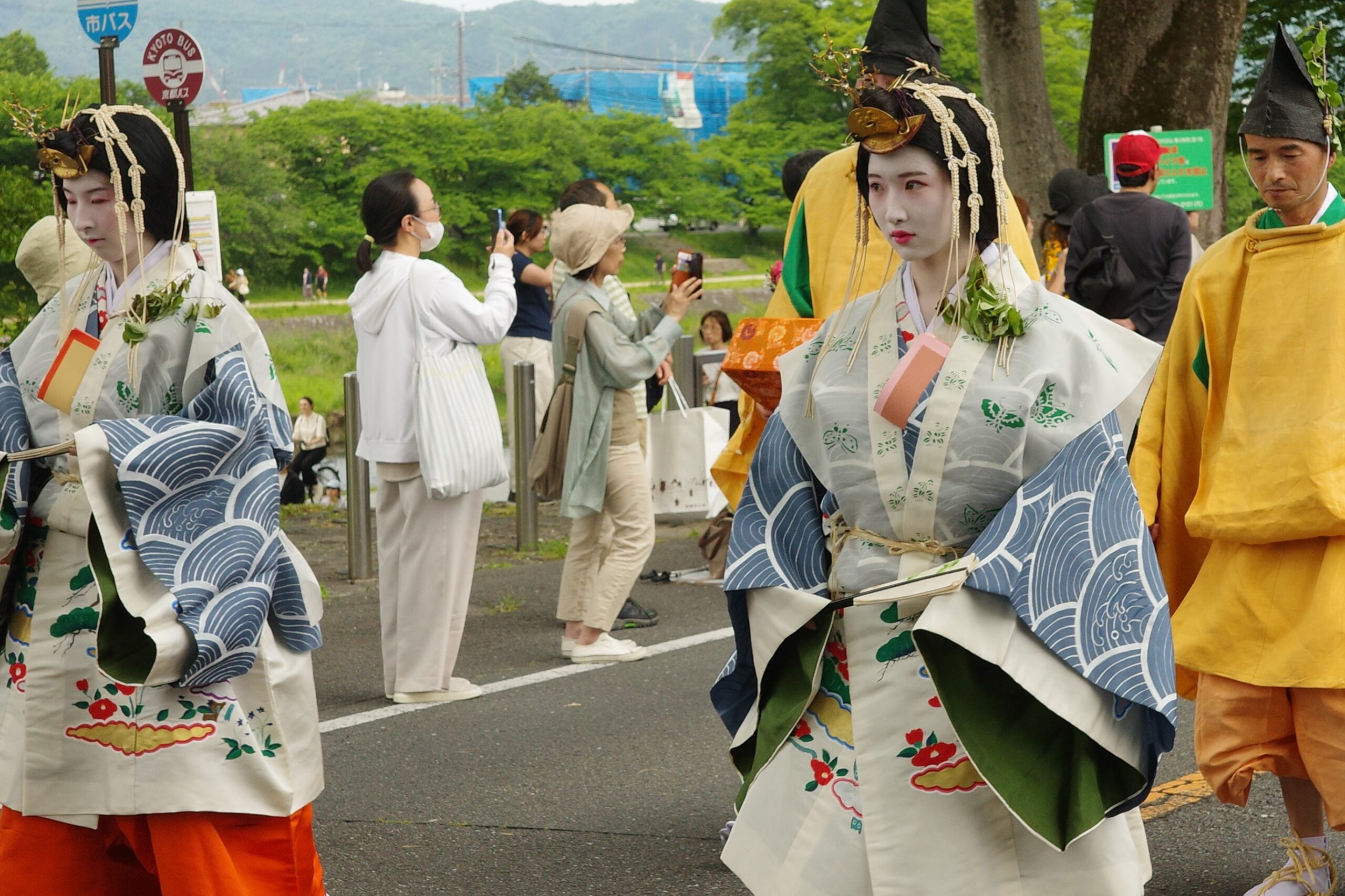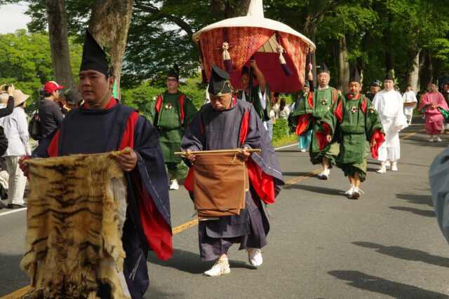葵祭は、祇園祭および時代祭とともに京都の三大祭りに数えられる、上賀茂神社および下鴨神社のお祭りです。祭の始まりは、1500年ほど前、都が凶作に見舞われ飢餓疫病が蔓延した時、占いを行うと賀茂神の祟りと出て、天皇が神社に勅使を遣わして「賀茂の神」の祭礼を行ったことと言い伝えられています。5月初旬からさまざまな行事(前儀)が行われ、5月15日にはこの祭りのハイライト「路頭の儀」が開催されます。上賀茂神社および下鴨神社の大神へ天皇からの御幣物(ごへいもつ)(贈り物)を届けるために、平安時代の装束を纏った人々が行列(行列の長さはおよそ1キロ)を作って、御所から下鴨神社、上賀茂神社へ約8キロの道を練り歩きます。行列には天皇の使いである勅使代を中心とする本列と、そのあとに斎王代を中心とする女人列が続きます。今回私は上賀茂神社に近い上賀茂橋のたもとで行列を見学しました。