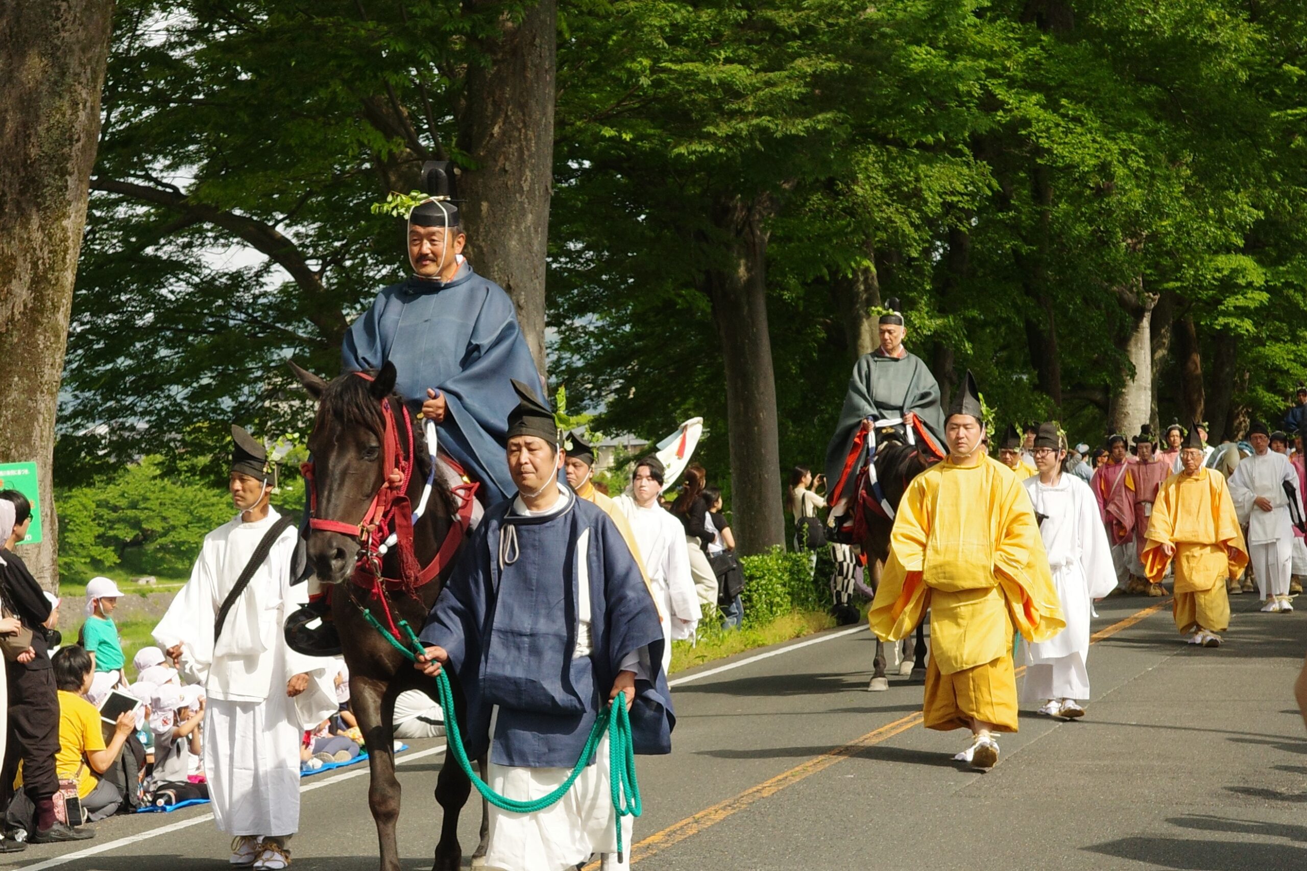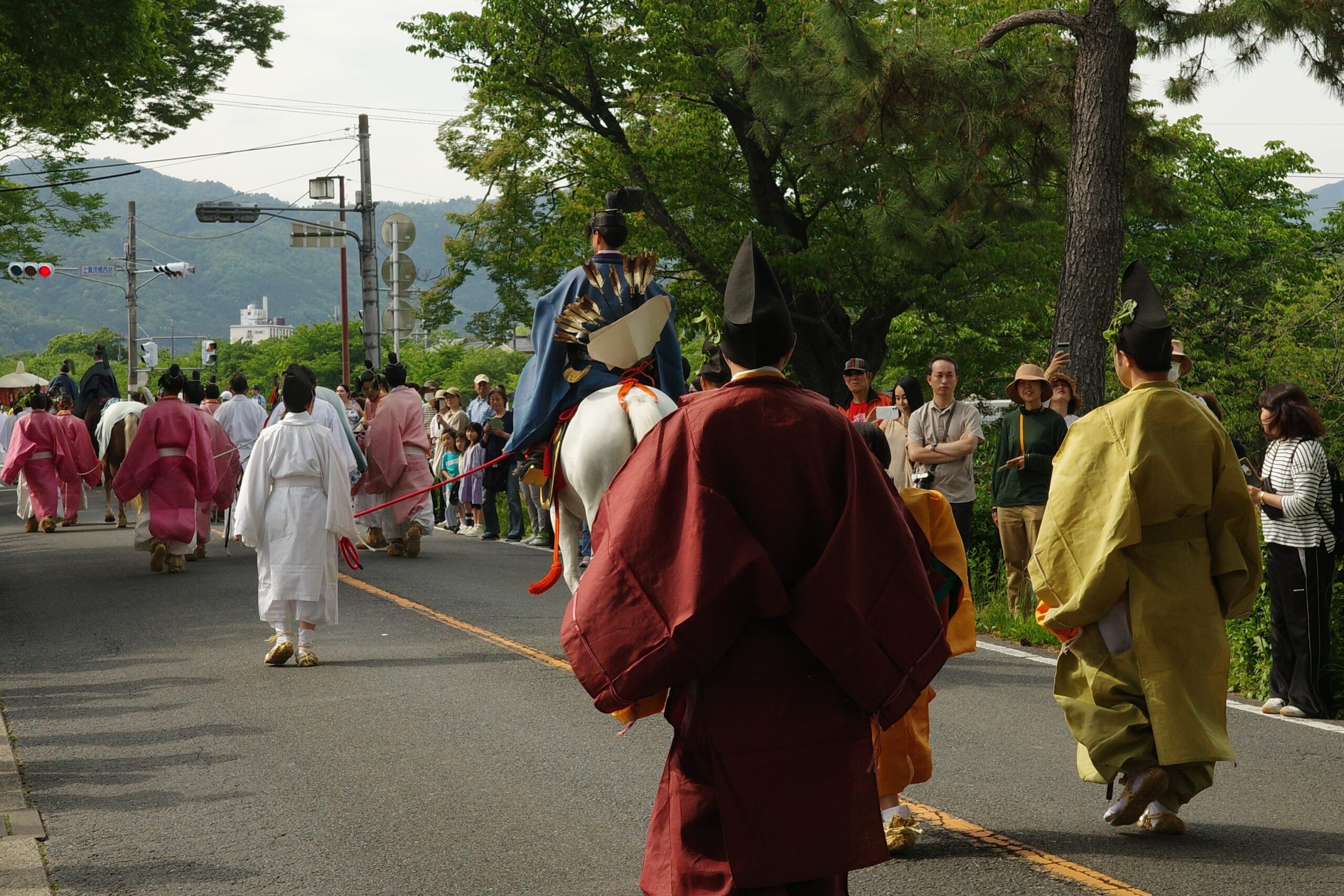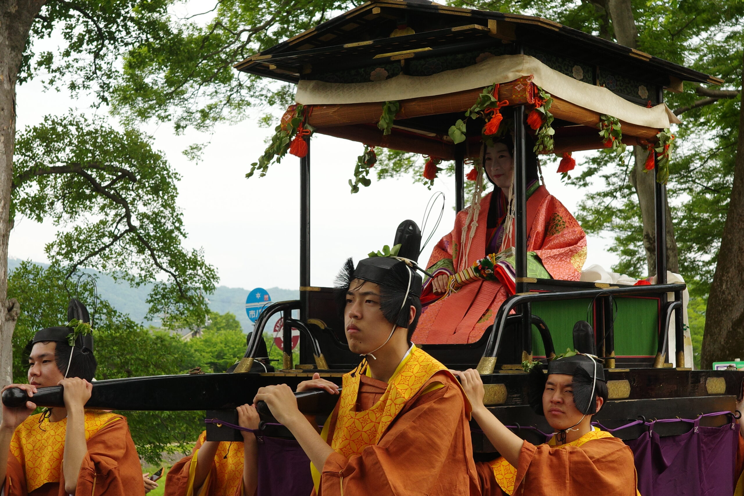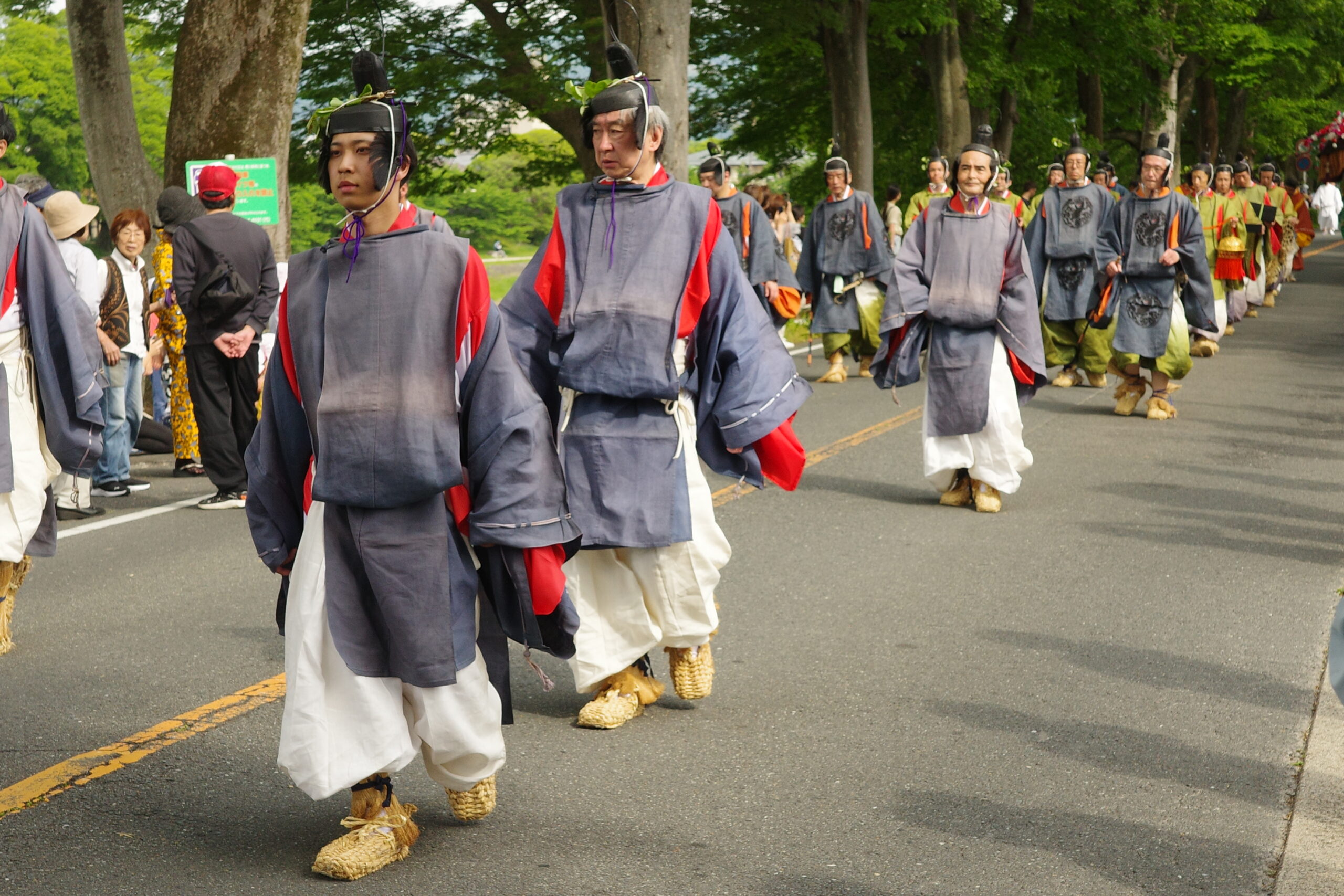 葵祭は、祇園祭および時代祭とともに京都の三大祭りに数えられる、上賀茂神社および下鴨神社のお祭りです。祭の始まりは、1500年ほど前、都が凶作に見舞われ飢餓疫病が蔓延した時、占いを行うと賀茂神の祟りと出て、天皇が神社に勅使を遣わして「賀茂の神」の祭礼を行ったことと言い伝えられています。5月初旬からさまざまな行事(前儀)が行われ、5月15日にはこの祭りのハイライト「路頭の儀」が開催されます。上賀茂神社および下鴨神社の大神へ天皇からの御幣物(ごへいもつ)(贈り物)を届けるために、平安時代の装束を纏った人々が行列(行列の長さはおよそ1キロ)を作って、御所から下鴨神社、上賀茂神社へ約8キロの道を練り歩きます。行列には天皇の使いである勅使代を中心とする本列と、そのあとに斎王代を中心とする女人列が続きます。今回私は上賀茂神社に近い上賀茂橋のたもとで行列を見学しました。