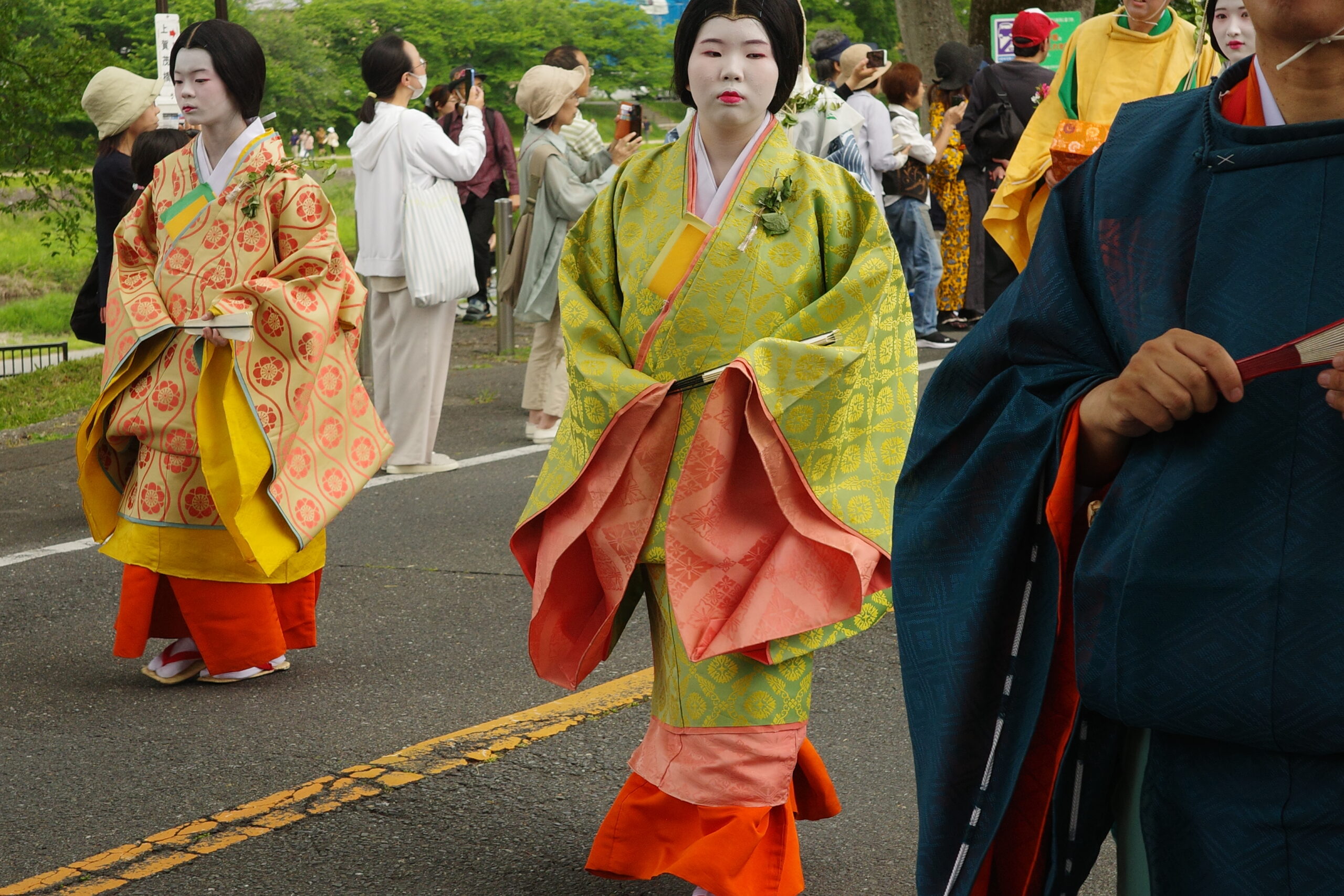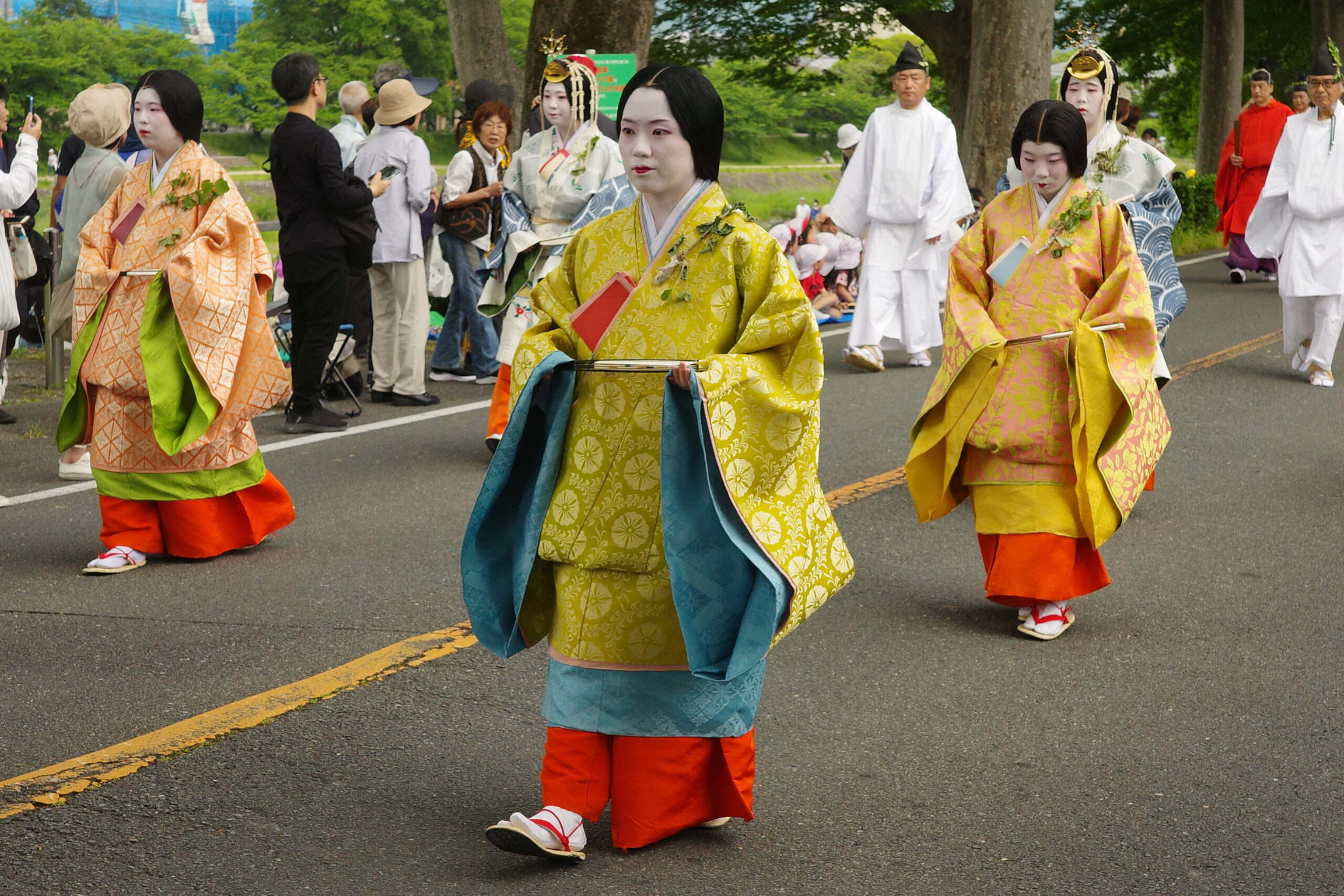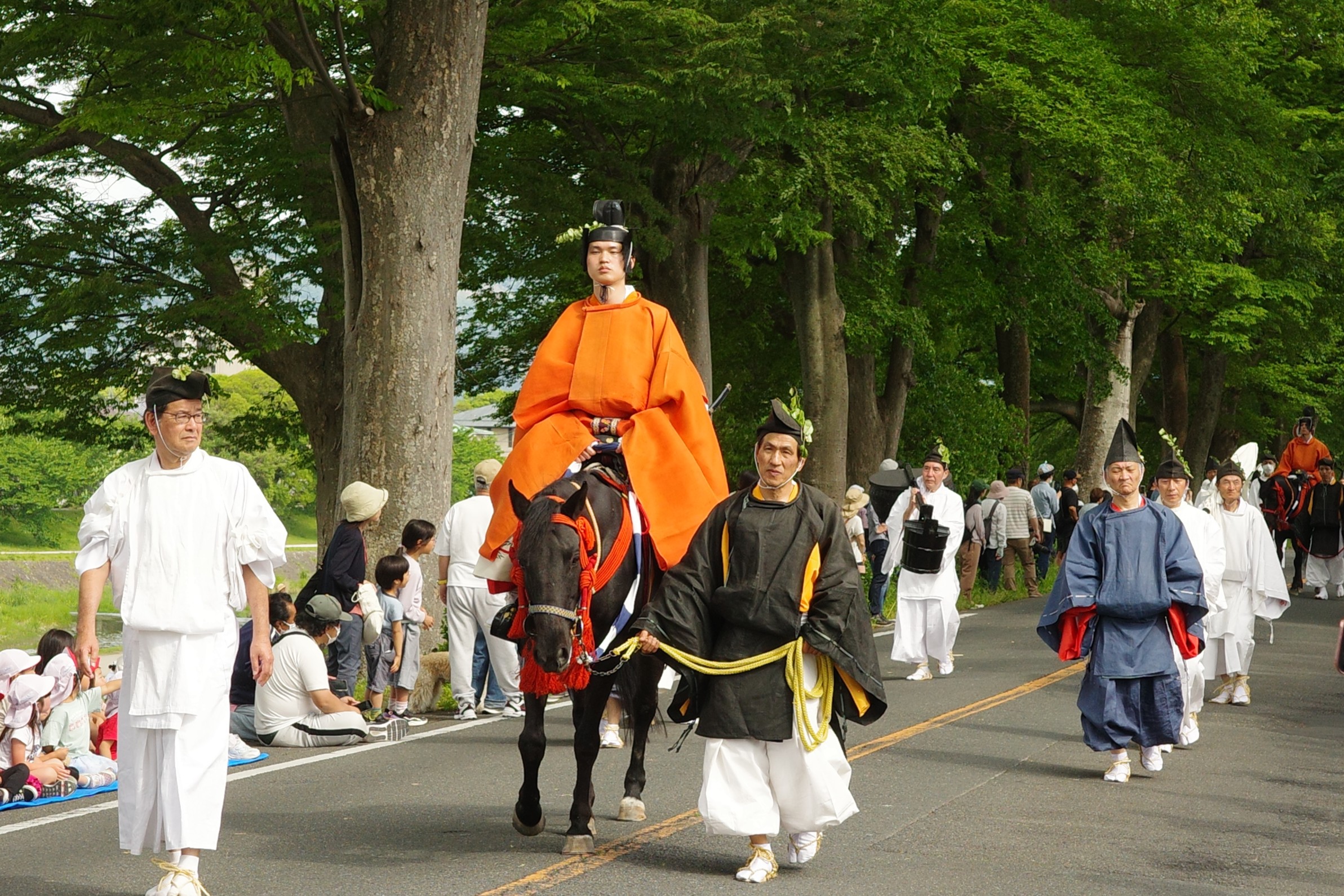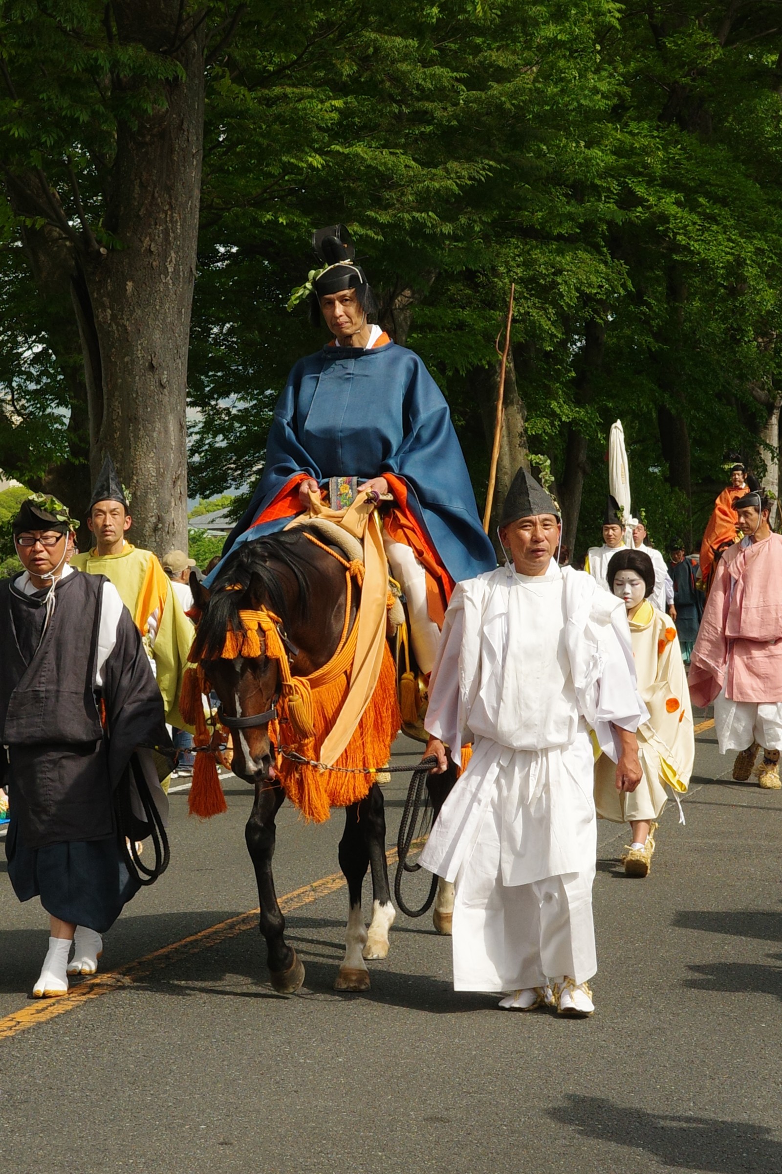 葵祭は、祇園祭および時代祭とともに京都の三大祭りに数えられる、上賀茂神社および下鴨神社のお祭りです。祭の始まりは、1500年ほど前、都が凶作に見舞われ飢餓疫病が蔓延した時、占いを行うと賀茂神の祟りと出て、天皇が神社に勅使を遣わして「賀茂の神」の祭礼を行ったことと言い伝えられています。5月初旬からさまざまな行事(前儀)が行われ、5月15日にはこの祭りのハイライト「路頭の儀」が開催されます。上賀茂神社および下鴨神社の大神へ天皇からの御幣物(ごへいもつ)(贈り物)を届けるために、平安時代の装束を纏った人々が行列(行列の長さはおよそ1キロ)を作って、御所から下鴨神社、上賀茂神社へ約8キロの道を練り歩きます。行列には天皇の使いである勅使代を中心とする本列と、そのあとに斎王代を中心とする女人列が続きます。今回私は上賀茂神社に近い上賀茂橋のたもとで行列を見学しました。