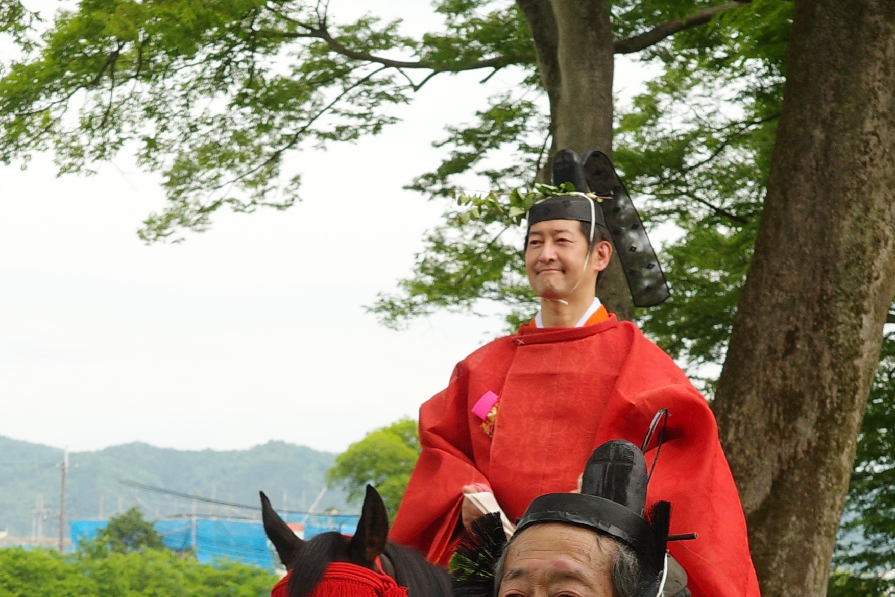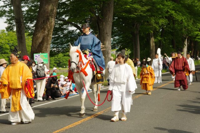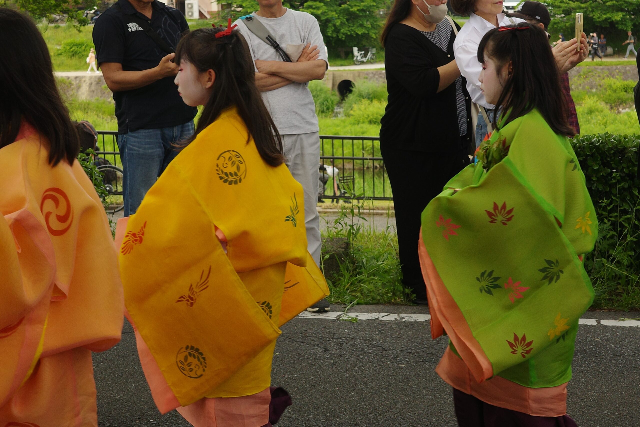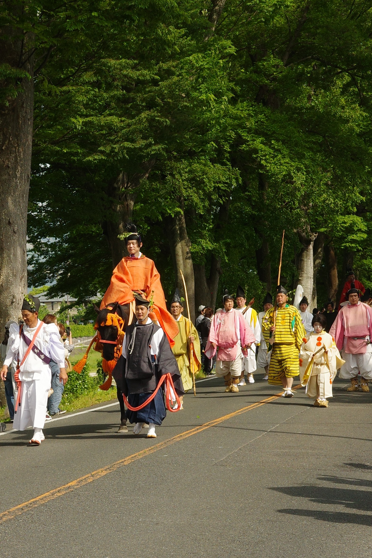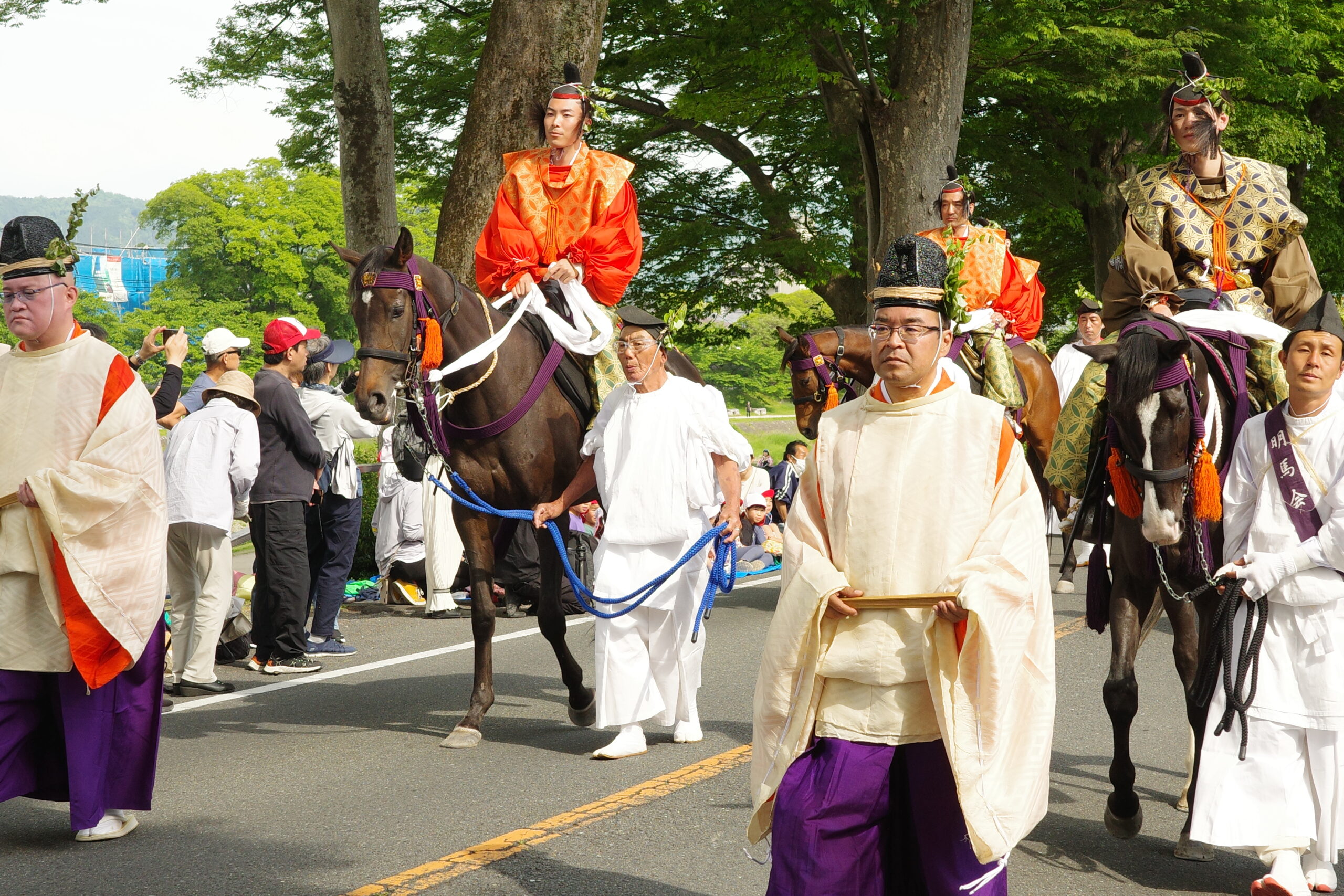 葵祭は、祇園祭および時代祭とともに京都の三大祭りに数えられる、上賀茂神社および下鴨神社のお祭りです。祭の始まりは、1500年ほど前、都が凶作に見舞われ飢餓疫病が蔓延した時、占いを行うと賀茂神の祟りと出て、天皇が神社に勅使を遣わして「賀茂の神」の祭礼を行ったことと言い伝えられています。5月初旬からさまざまな行事(前儀)が行われ、5月15日にはこの祭りのハイライト「路頭の儀」が開催されます。上賀茂神社および下鴨神社の大神へ天皇からの御幣物(ごへいもつ)(贈り物)を届けるために、平安時代の装束を纏った人々が行列(行列の長さはおよそ1キロ)を作って、御所から下鴨神社、上賀茂神社へ約8キロの道を練り歩きます。行列には天皇の使いである勅使代を中心とする本列と、そのあとに斎王代を中心とする女人列が続きます。今回私は上賀茂神社に近い上賀茂橋のたもとで行列を見学しました。