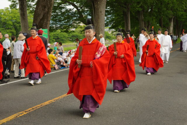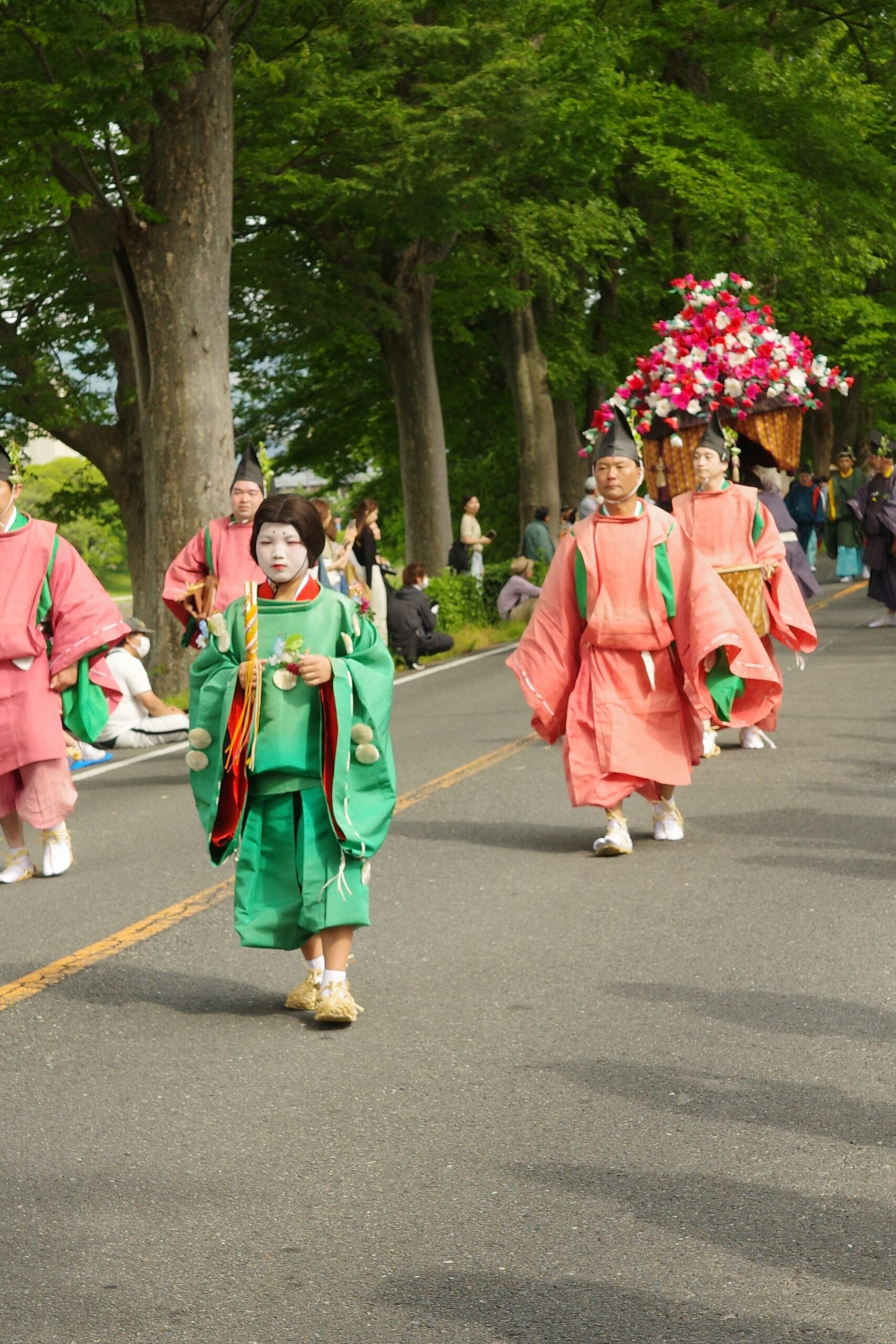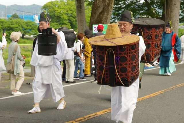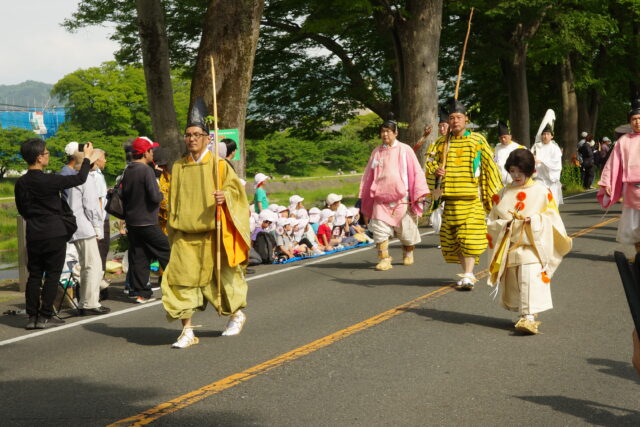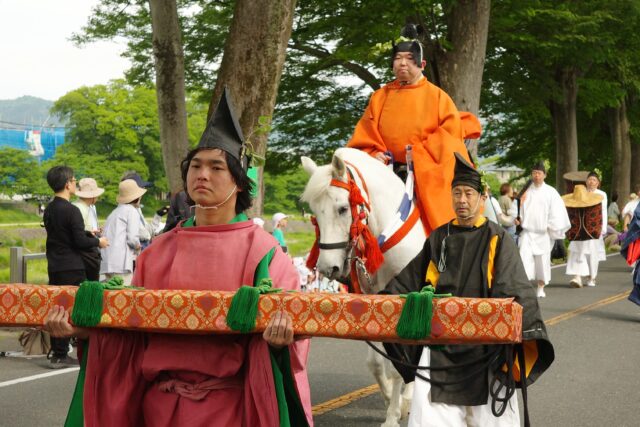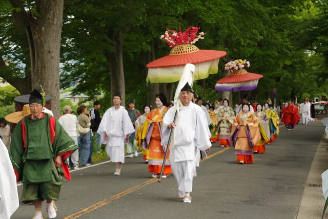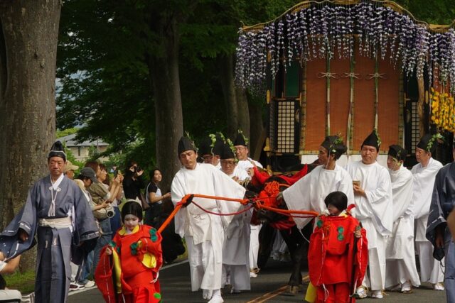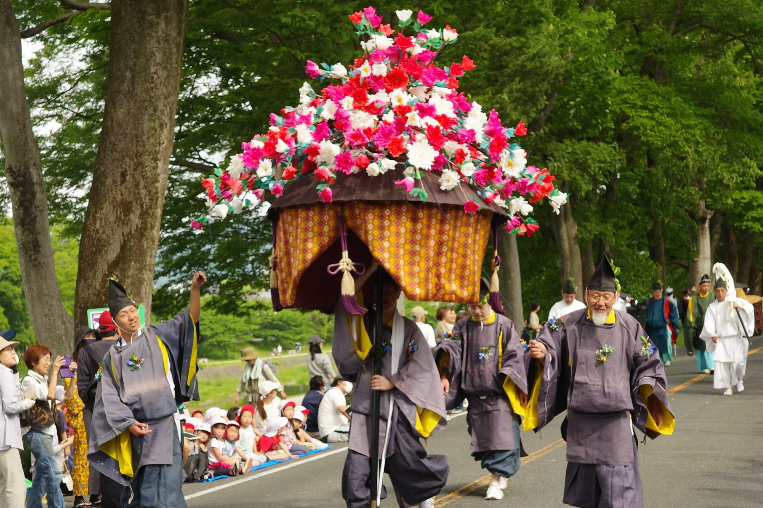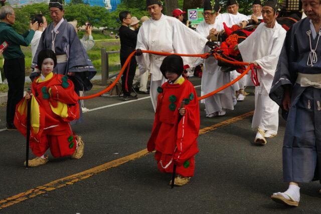 本列の中心人物の勅使代は、赤い服を着て馬に乗り、懐から天皇からの書状(ピンク)を覗かせています。勅使代の写真がありますので探してみてください。この他に検非違使、山城使、牛車、風流傘などが行列を作っています。ひときわ目を引く乗り物が「御所車」と呼ばれる牛車で、薄紫色の藤の花の装飾を揺らしながら、ゆっくり進んでいきます。車輪が回る時に出る独特の音は他では聞けないものでした。大きな傘に牡丹や杜若などの花を飾り付けているのは風流傘、さらにさまざまな道具類を持った大人や子供達が行進して行きました。