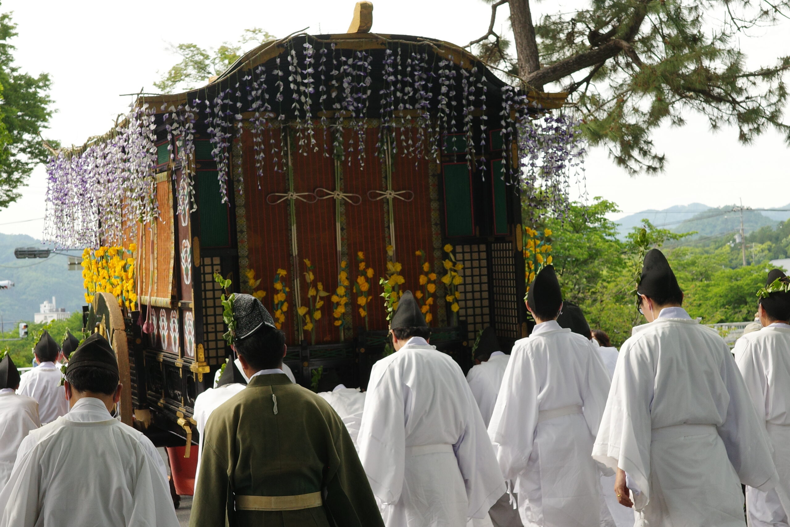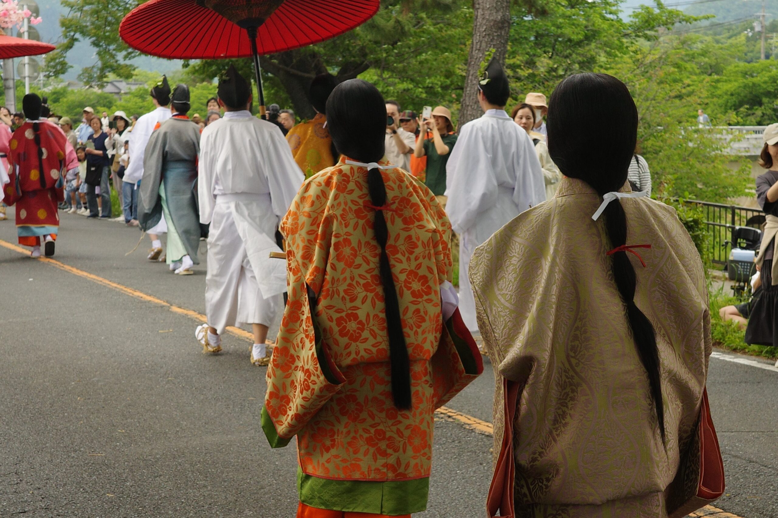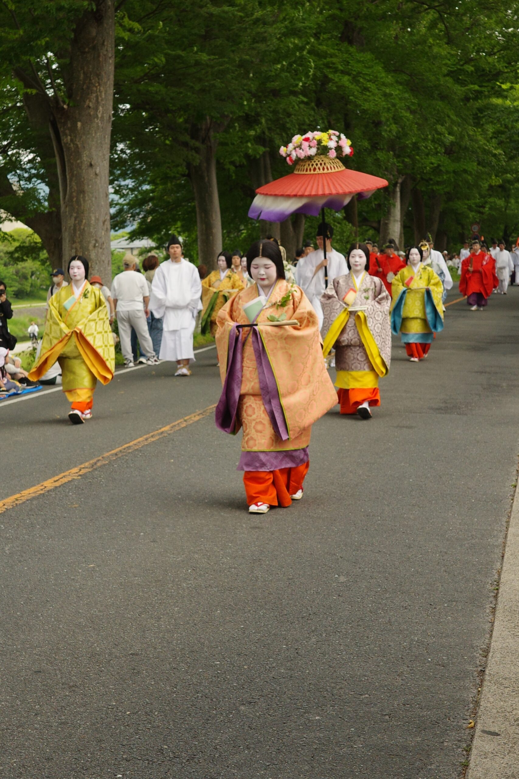 本列の中心人物の勅使代は、赤い服を着て馬に乗り、懐から天皇からの書状(ピンク)を覗かせています。勅使代の写真がありますので探してみてください。この他に検非違使、山城使、牛車、風流傘などが行列を作っています。ひときわ目を引く乗り物が「御所車」と呼ばれる牛車で、薄紫色の藤の花の装飾を揺らしながら、ゆっくり進んでいきます。車輪が回る時に出る独特の音は他では聞けないものでした。大きな傘に牡丹や杜若などの花を飾り付けているのは風流傘、さらにさまざまな道具類を持った大人や子供達が行進して行きました。