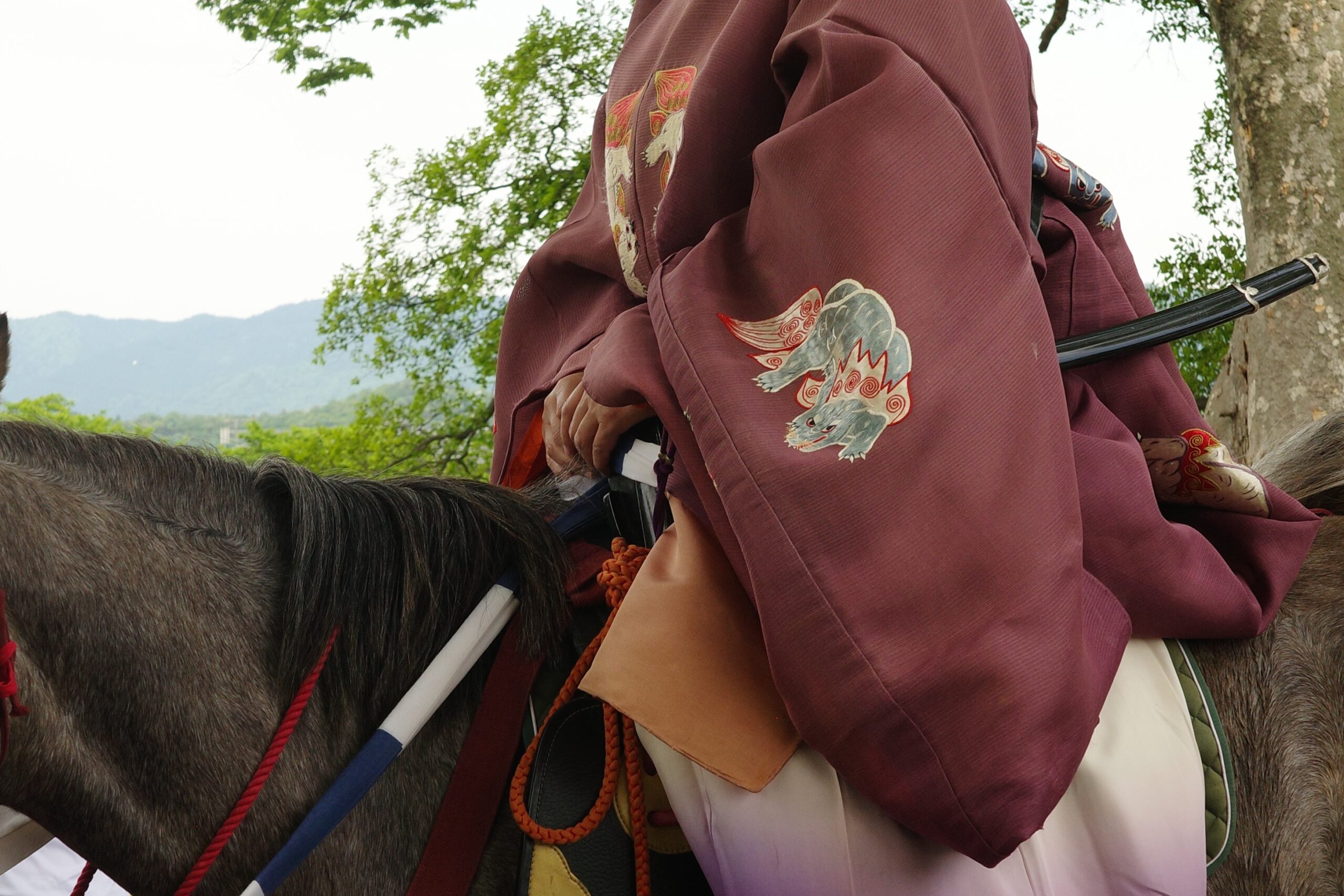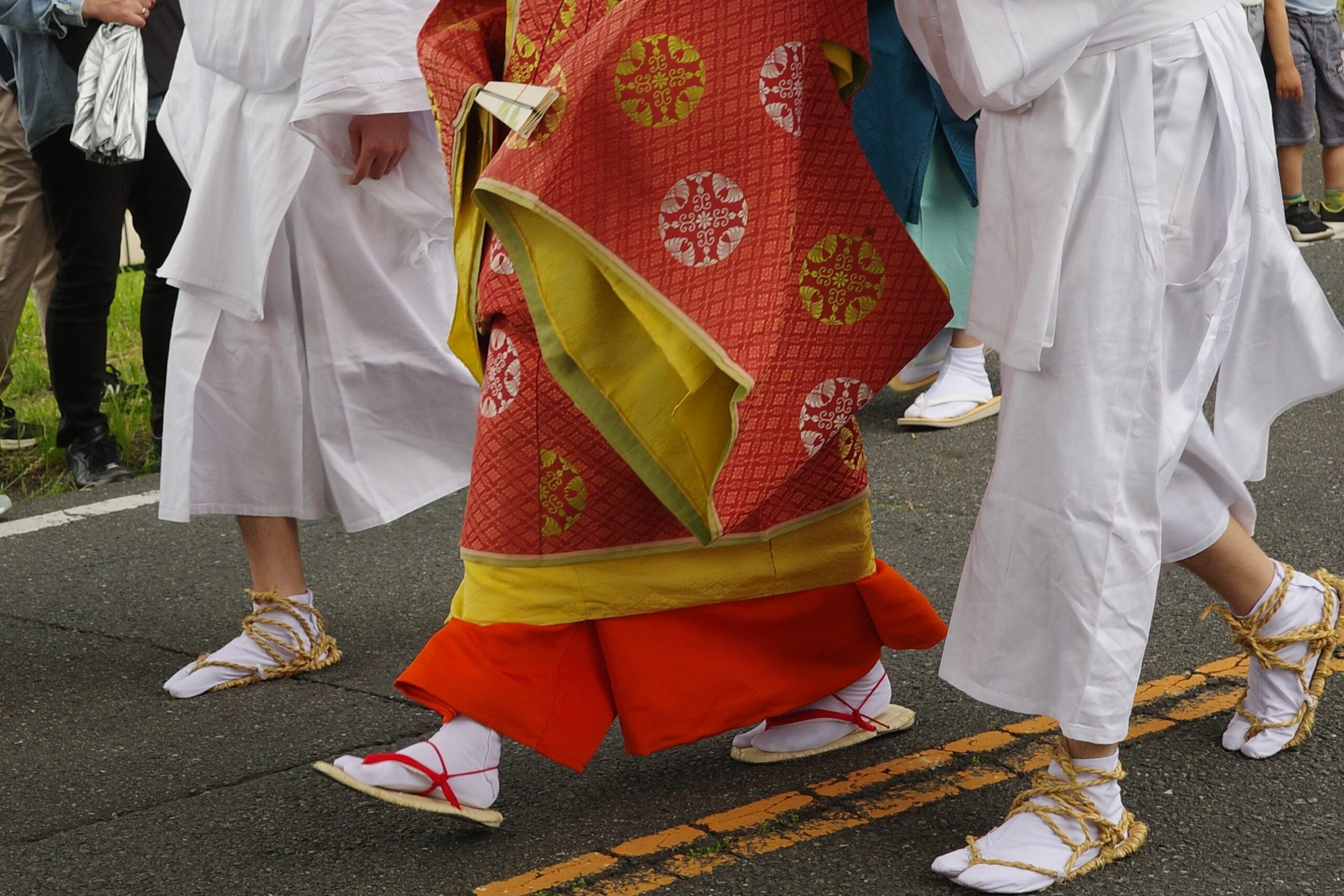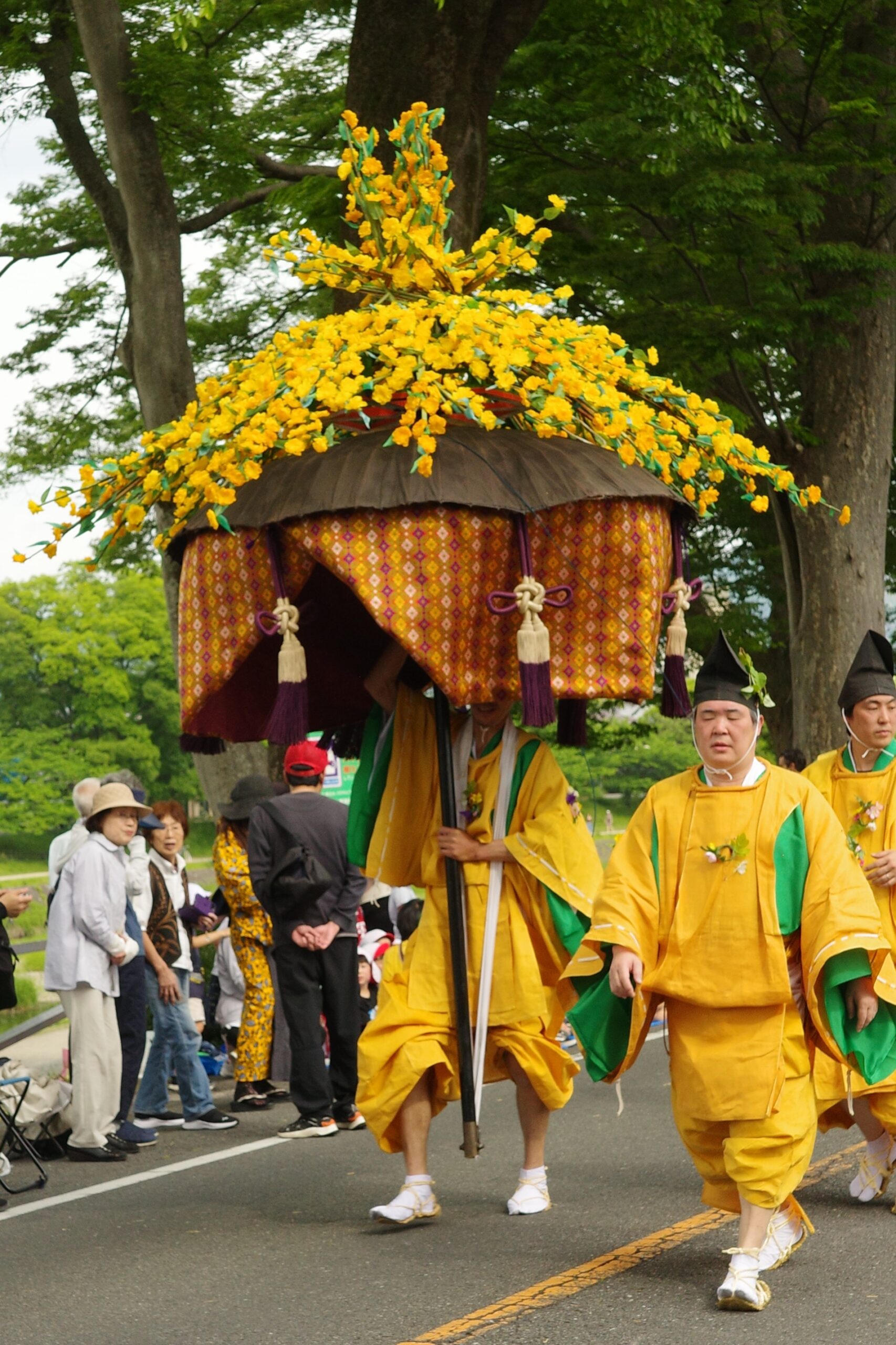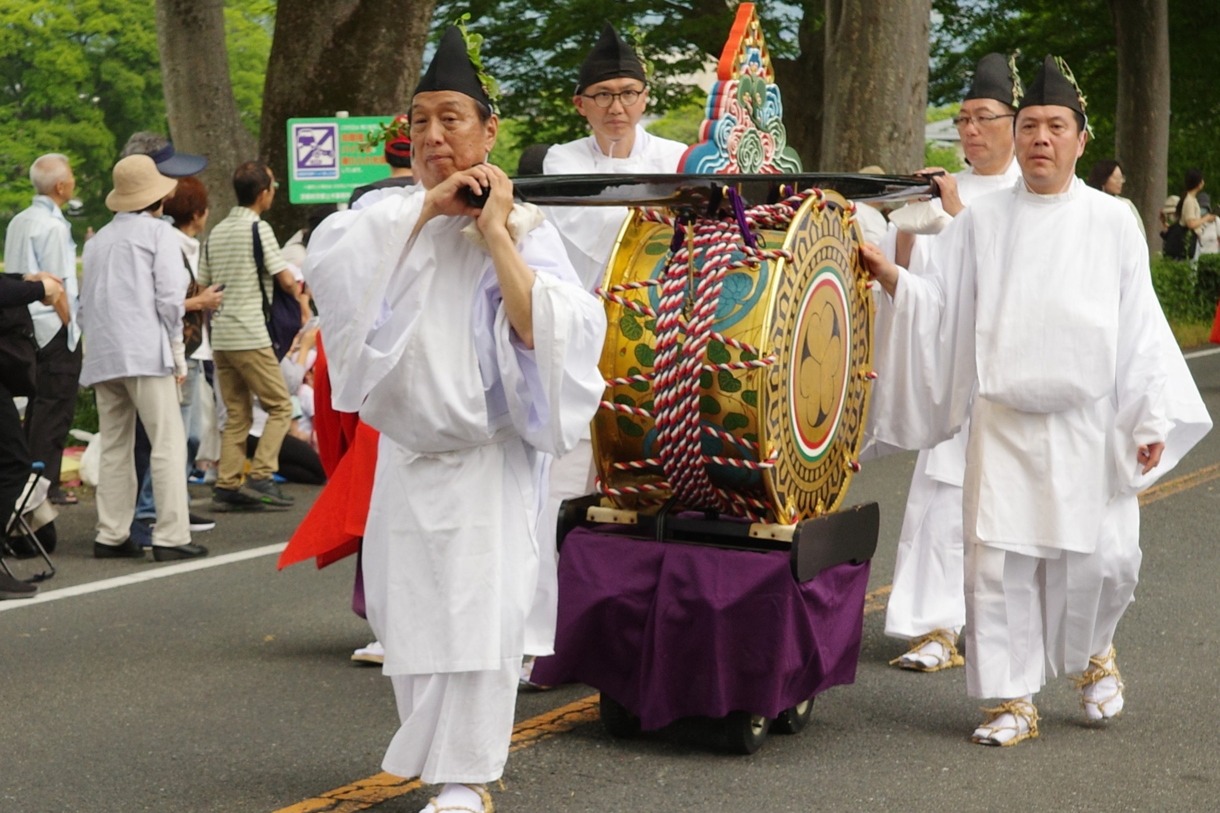 本列の中心人物の勅使代は、赤い服を着て馬に乗り、懐から天皇からの書状(ピンク)を覗かせています。勅使代の写真がありますので探してみてください。この他に検非違使、山城使、牛車、風流傘などが行列を作っています。ひときわ目を引く乗り物が「御所車」と呼ばれる牛車で、薄紫色の藤の花の装飾を揺らしながら、ゆっくり進んでいきます。車輪が回る時に出る独特の音は他では聞けないものでした。大きな傘に牡丹や杜若などの花を飾り付けているのは風流傘、さらにさまざまな道具類を持った大人や子供達が行進して行きました。