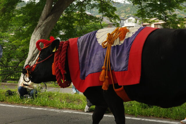 この後、牛車がもう一台来るということで20分程待ったのですが全く現れず、交通規制していた警察官もどうしようかと色んな所と連絡を取り合っている様子でした。下鴨神社から行列についてきた人の話では、牛は下鴨神社を出るときからぐずっていたようで、道中のどこかで停滞しているようでした。機嫌が直らないとどうしようもない(牛は人の言うことは聞いてくれない)ということなので、結局この日はそのまま帰ることにしました。