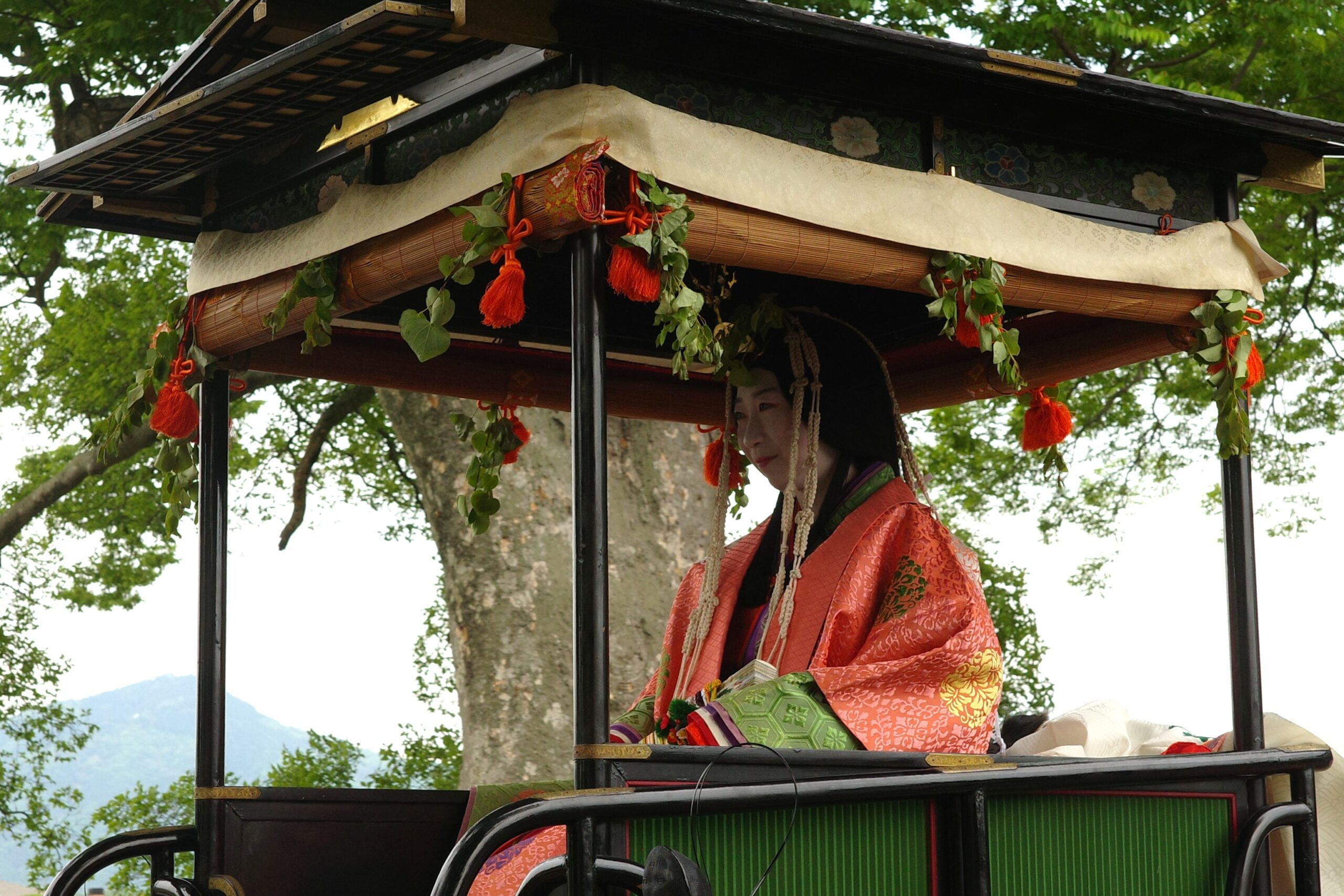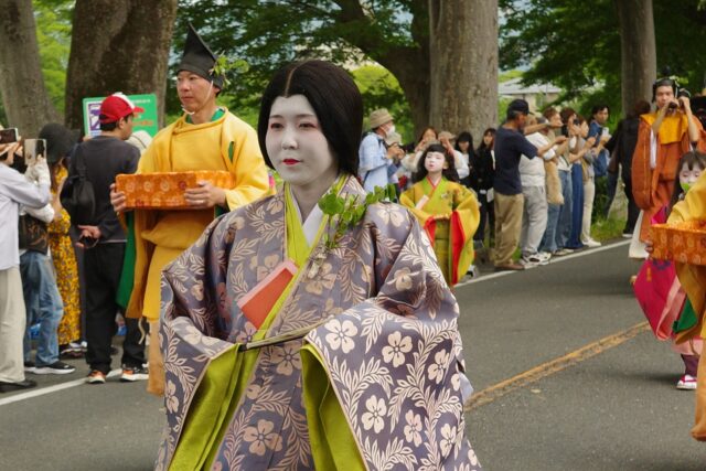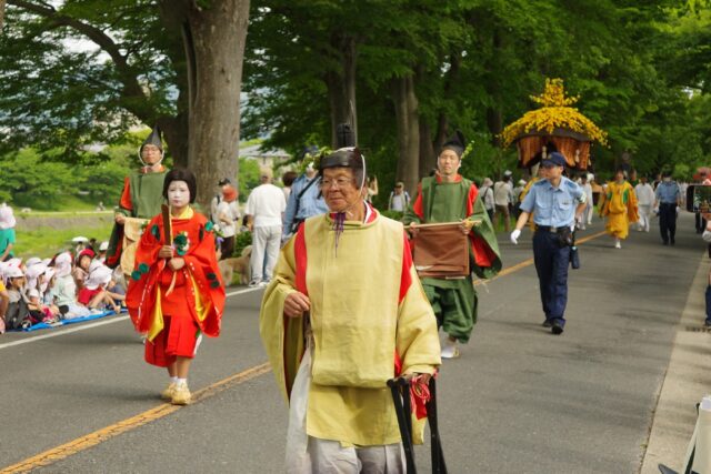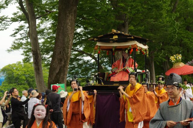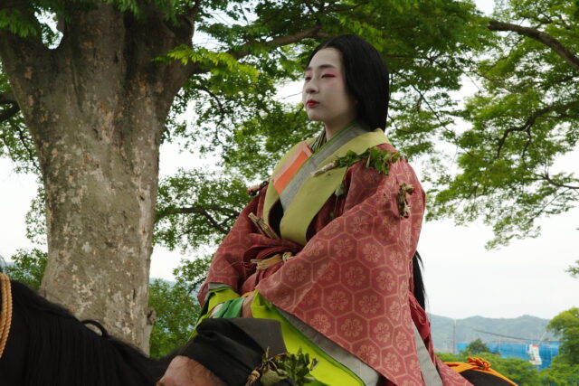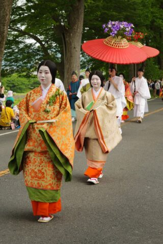 風流傘が去った後に女人列が続きます。女人列には何と言っても葵祭のヒロインである斎王代が登場します。平安時代には内親王が「斎王」として祭に奉仕していましたが、鎌倉時代に途絶えてしまいました。昭和31(1956)年、葵祭を盛り上げようと市民から斎王代が選ばれ、女人列が復活したそうです。斎王代は、五衣裳唐衣(いつつぎぬものからぎぬ)をまとい、腰輿(およよ)という輿(四方が開放され御簾が取り付けてある)に乗っています。命婦(みょうぶ、高位の女官や高官の妻)や駒女(むなのりおんな、馬に乗った巫女)、その他の女官も行進します。女性の列はとても華やかで見ているだけで笑顔がこぼれますね。