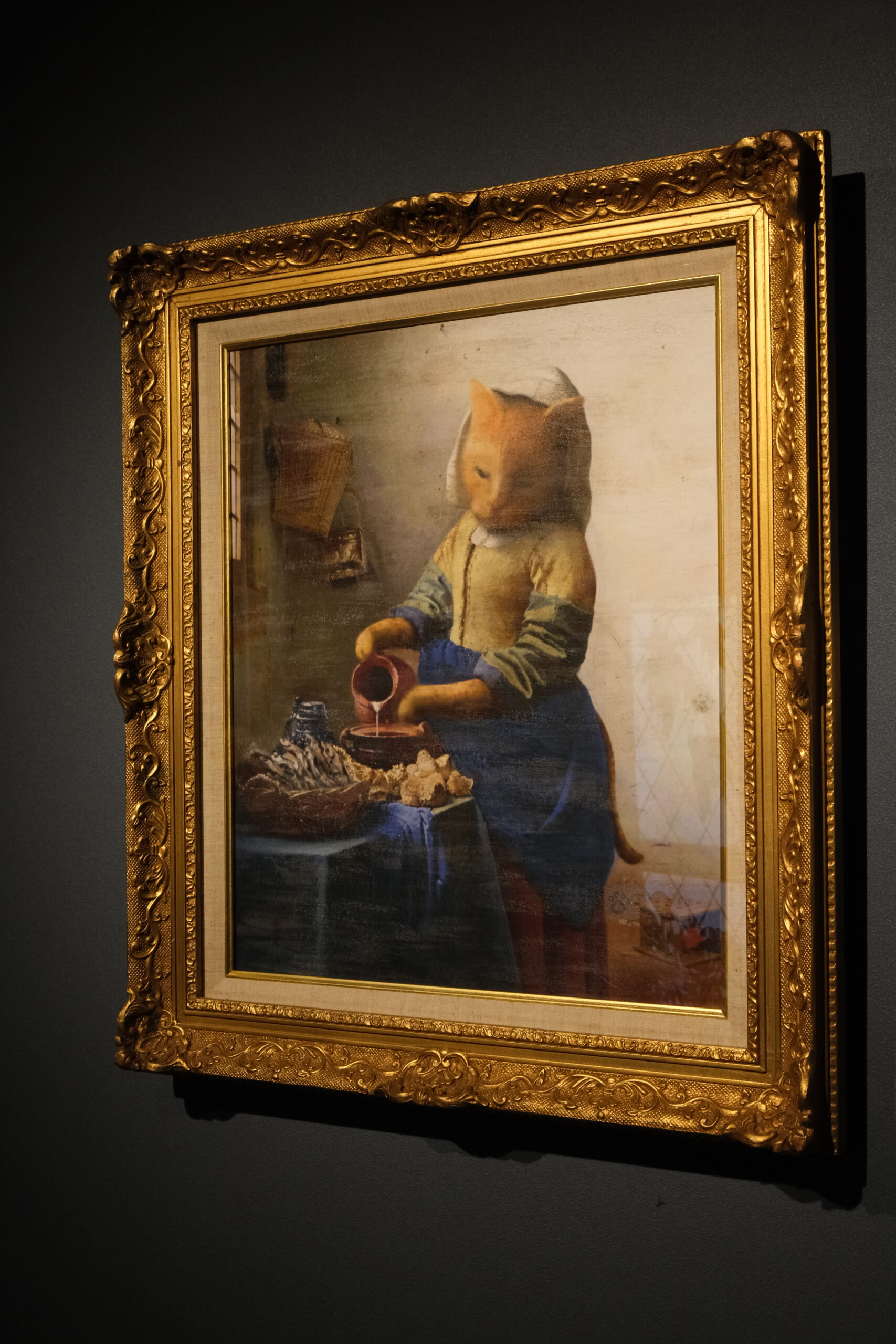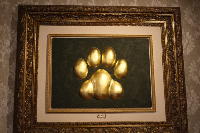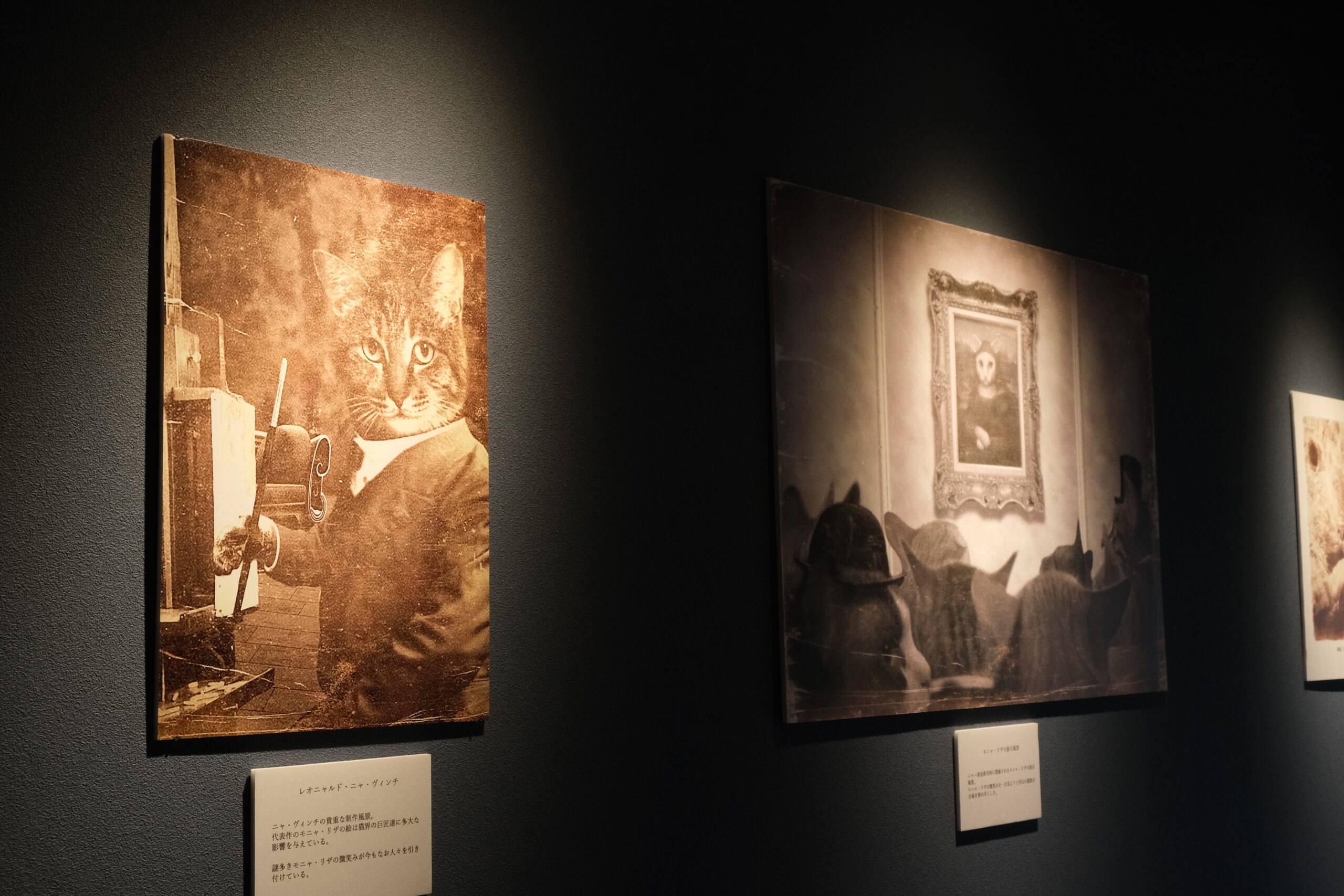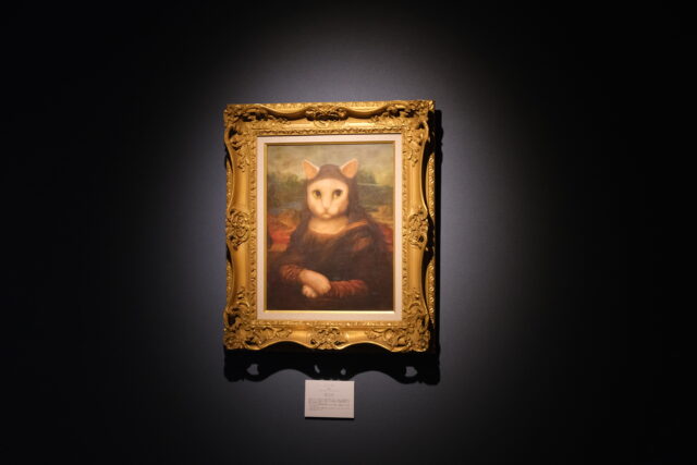 中に入ると展示された絵画や作品を光から守るためか、うす暗い空間がひろがり、ジャズが静かに流れていました。「世界中の誰もが知っている作品を猫に変身させたら、きっと多くの方々に楽しんでもらえるのでは」との発想から生まれた作品が200点以上展示されています。猫の手形はこの博物館のシンボルマークだそうです。