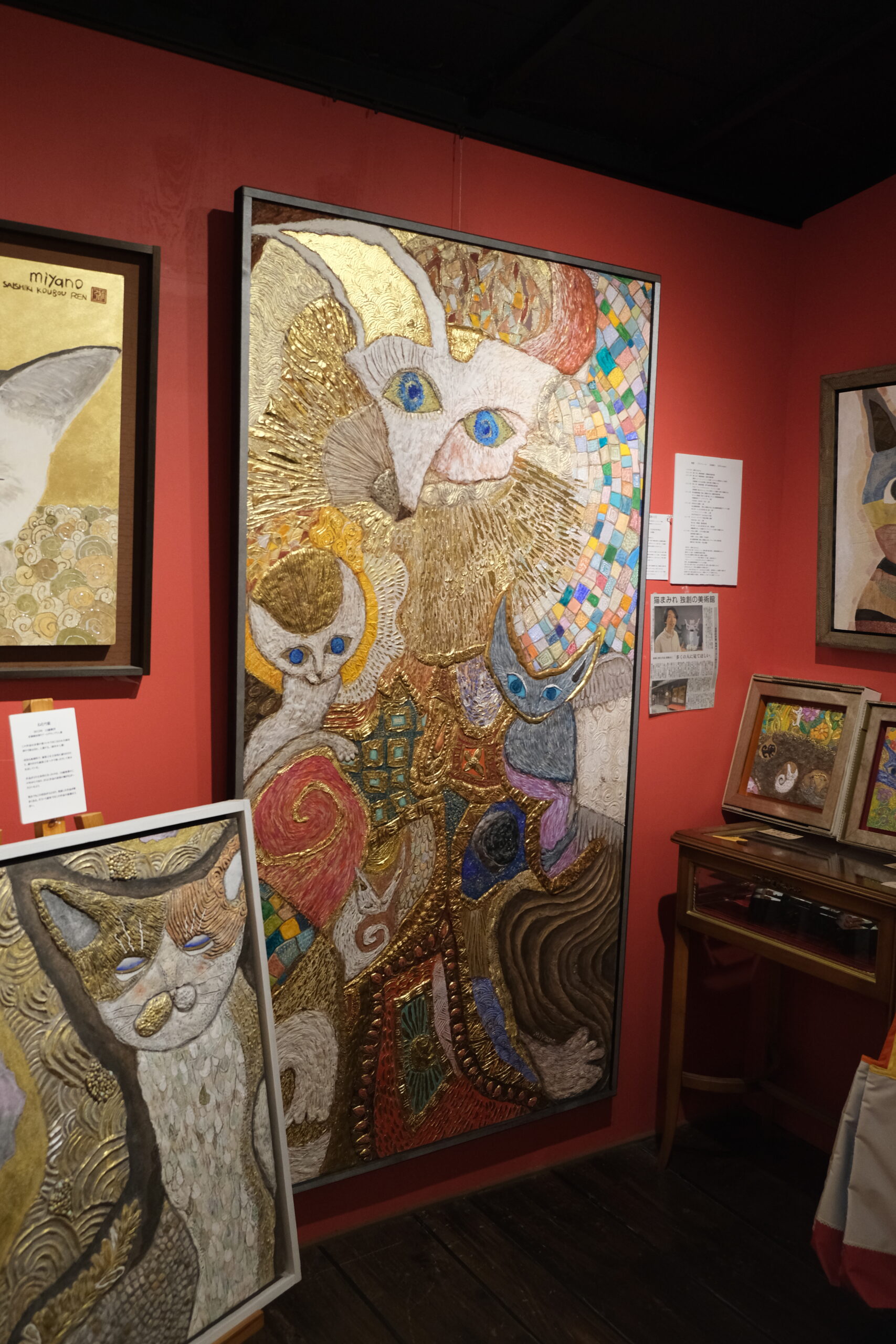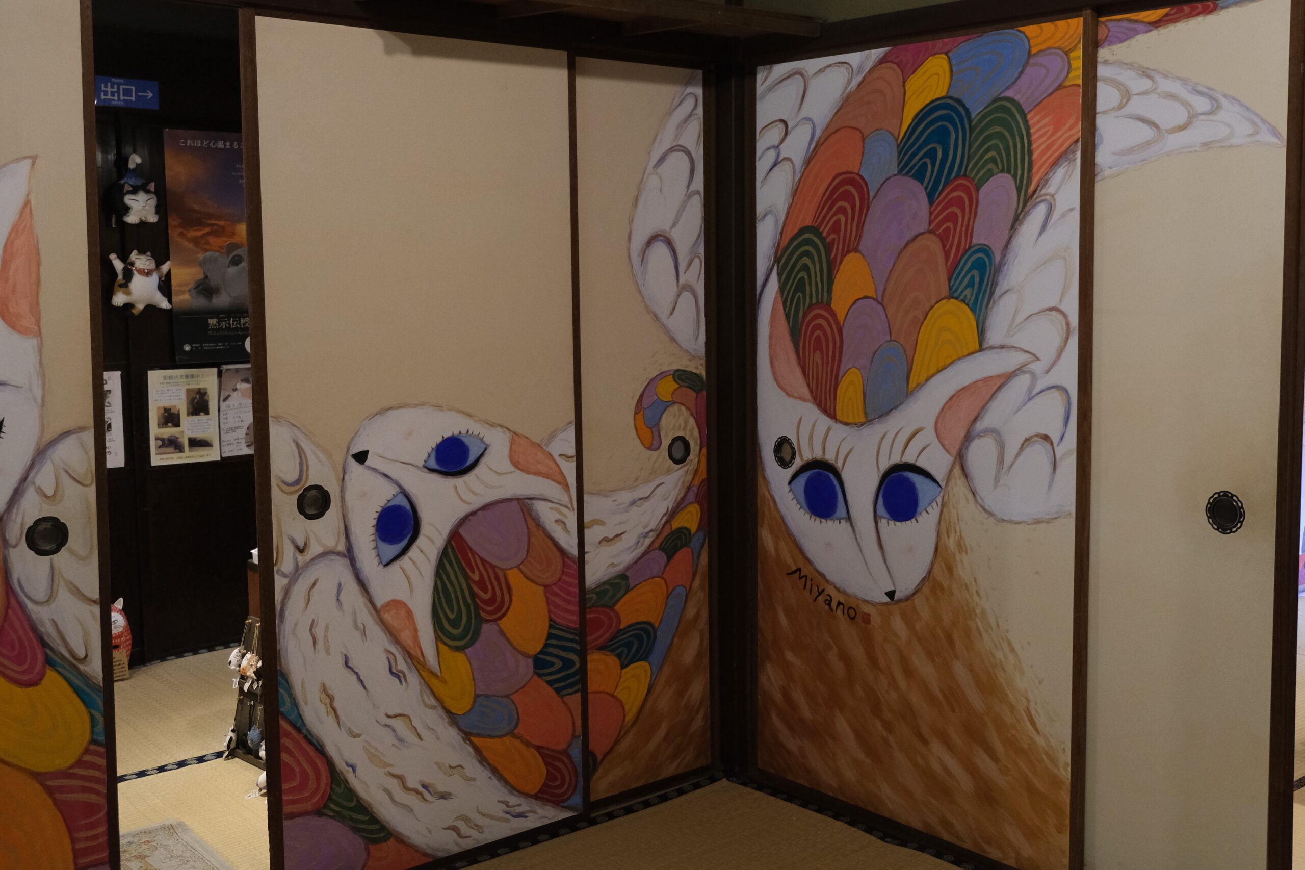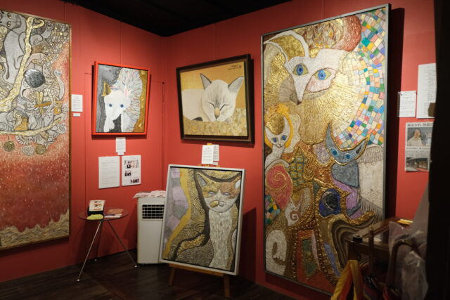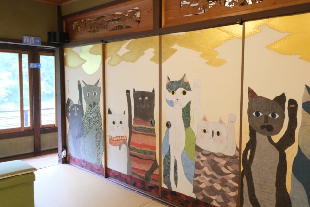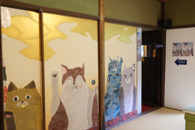 加悦徹・順子ご夫妻と息子さんの雅乃さんの御一家が営むこの美術館は、2011年の東日本大震災をきっかけに「人生何があるかわからない、悔いを残すことがないよう、自分たちが本当にやりたい事をやっていこう!」と決意して始めたそうです。小さな雑貨店から、2016年ついに古民家を手に入れ、家族でコツコツと改装して猫猫寺をオープンさせました。徹さんは神社仏閣に関わる彩色を手掛ける彩色師、順子さんはフェルト作家、そして雅乃さんは小さいころから猫の絵を描き、いろいろな賞を受賞し(最初の受賞は11歳の時)、現在は猫作家として活躍されています。ここで展示されている襖絵は雅乃さんの作品です。さらに、最初にご紹介した猫博の作品は全て雅乃さんが制作されたものです。
