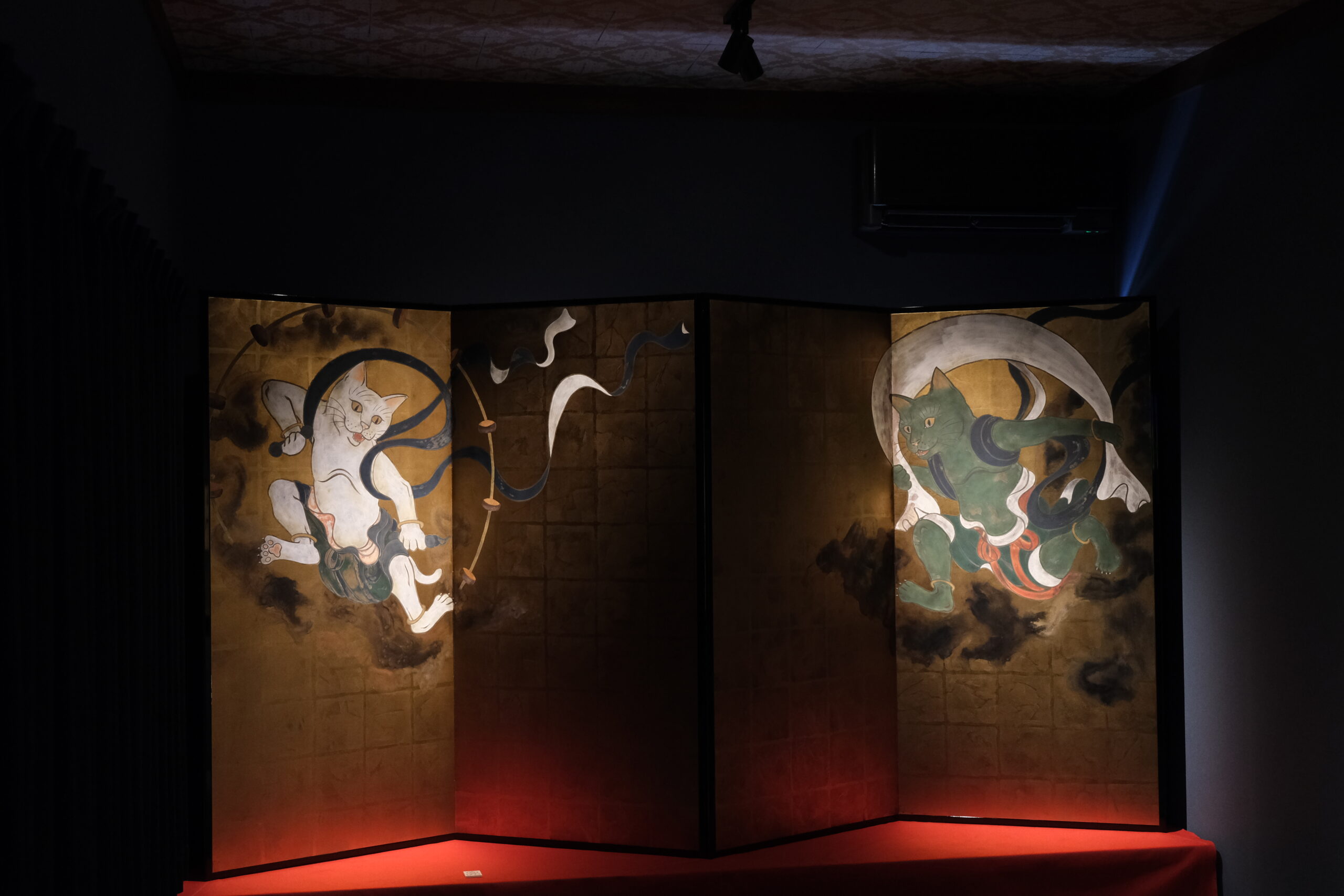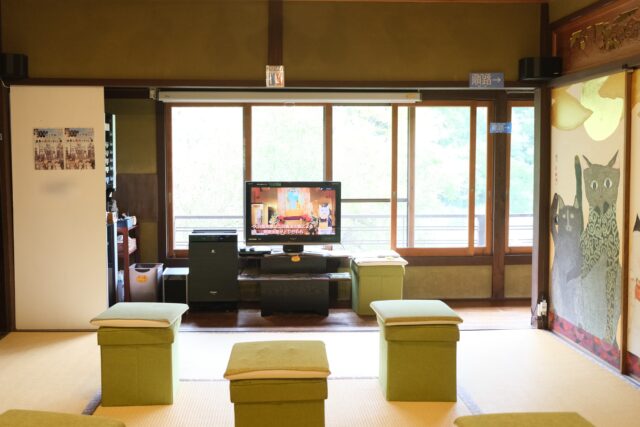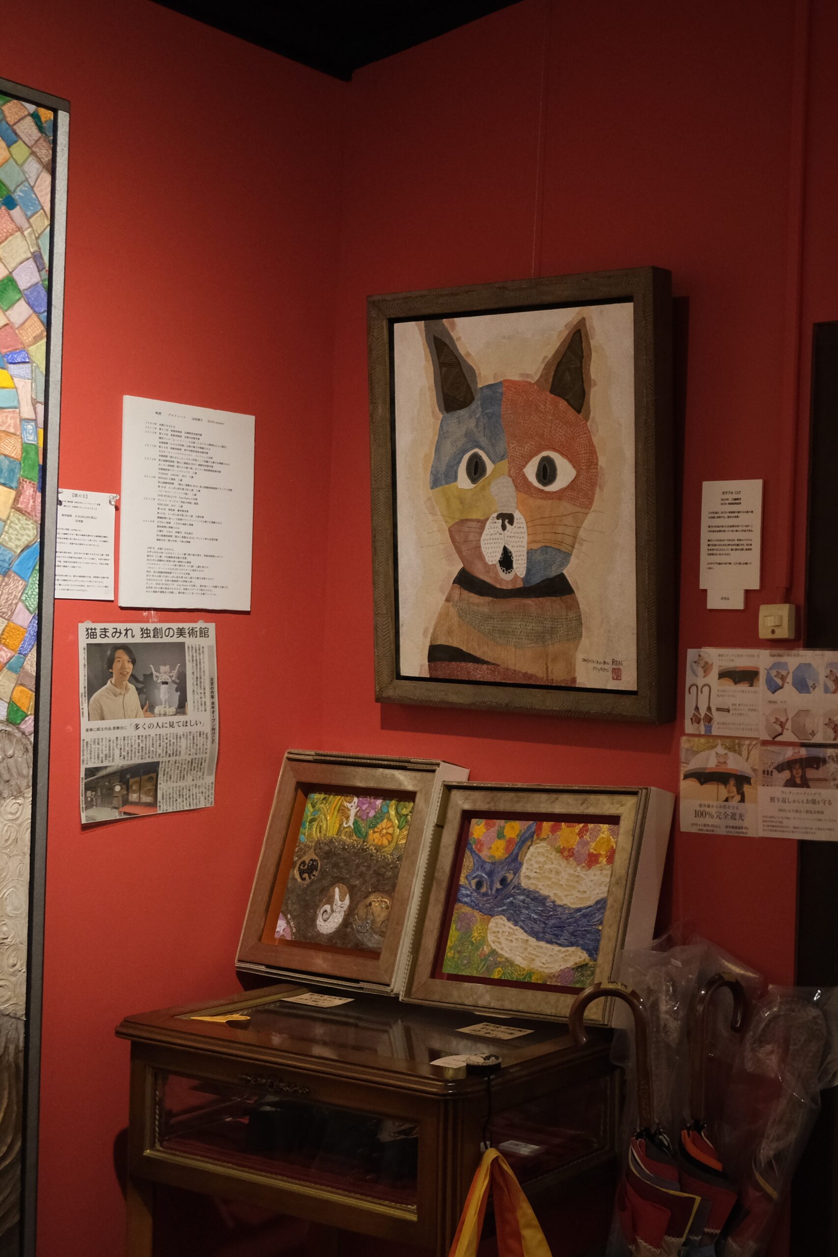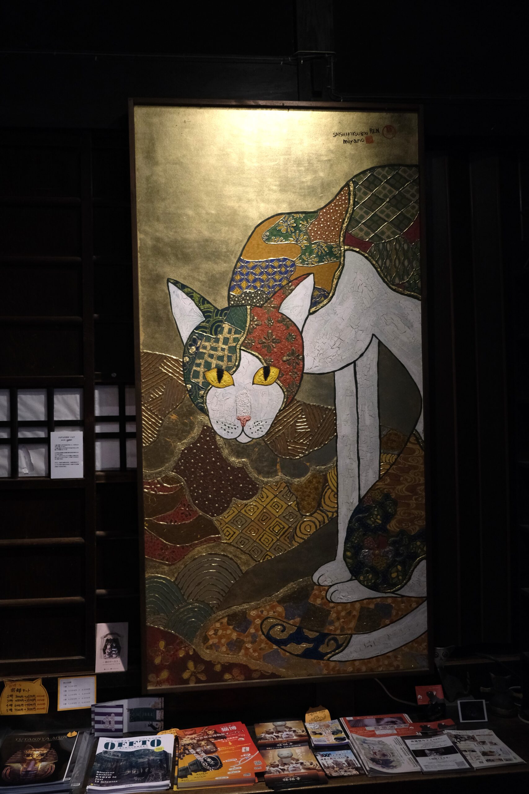 加悦徹・順子ご夫妻と息子さんの雅乃さんの御一家が営むこの美術館は、2011年の東日本大震災をきっかけに「人生何があるかわからない、悔いを残すことがないよう、自分たちが本当にやりたい事をやっていこう!」と決意して始めたそうです。小さな雑貨店から、2016年ついに古民家を手に入れ、家族でコツコツと改装して猫猫寺をオープンさせました。徹さんは神社仏閣に関わる彩色を手掛ける彩色師、順子さんはフェルト作家、そして雅乃さんは小さいころから猫の絵を描き、いろいろな賞を受賞し(最初の受賞は11歳の時)、現在は猫作家として活躍されています。ここで展示されている襖絵は雅乃さんの作品です。さらに、最初にご紹介した猫博の作品は全て雅乃さんが制作されたものです。
