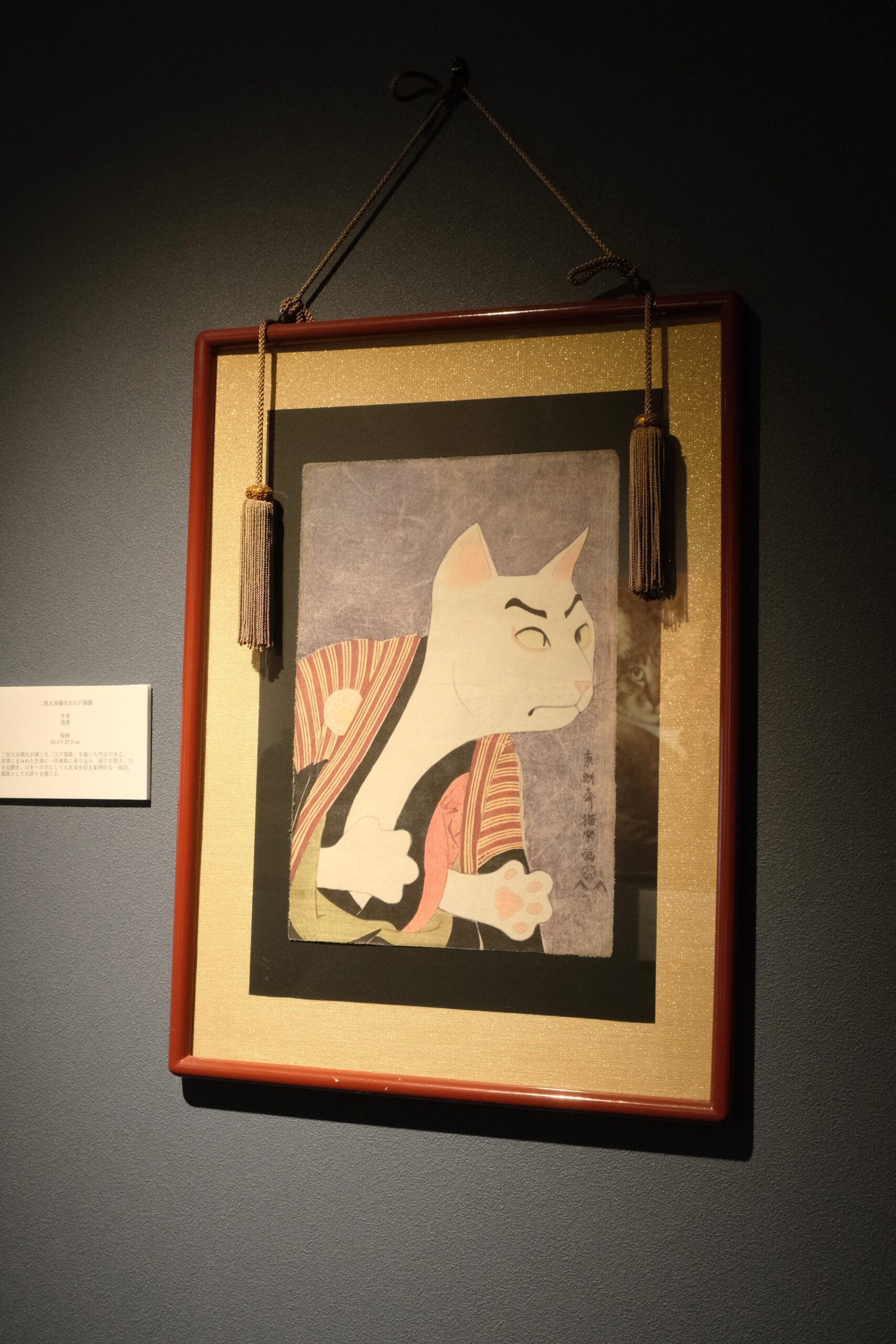 ご覧のように、展示物は、世界の名画の主人公を猫に置き換えた絵や、猫の浮世絵・戯画、猫の戦国武将、猫の仏像、古代の猫などです。特にそのタイトルが秀逸で、ツタンニャーメン、モニャ・リザなど作品全てのタイトルがどこかに「ニャ」が入っていて笑ってしまいました。風林猫山、ニャー大陸、いつか図録を出してほしいです。