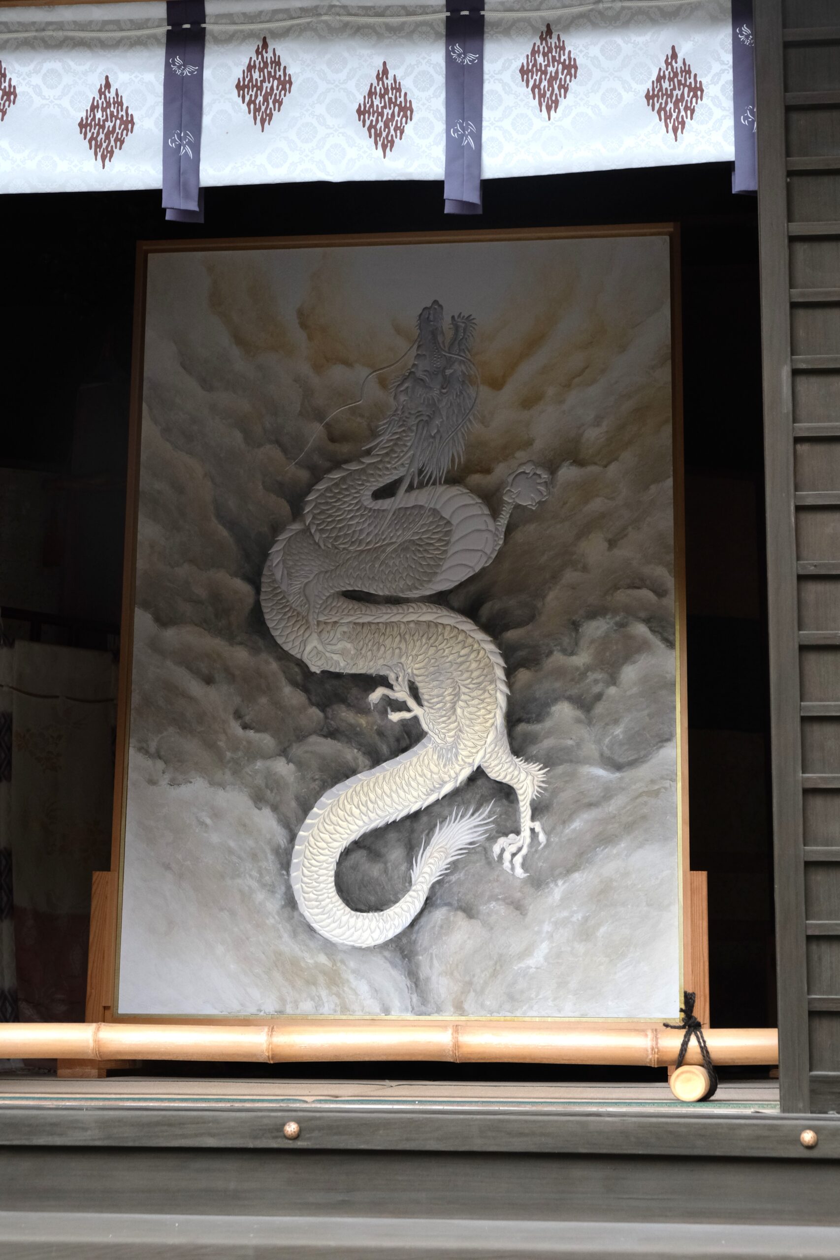 九頭竜の透明感を表現するため、白金パールという画材を用いたそうです。竜神は胡粉を盛り上げて描いて立体感を出しています。そのうえパールの絵具は光により金や銀、白や虹色にと変化するので、朝夕の陽の当たり方や天候の違い、見る角度によって竜神の色が変わって見えるそうです。
