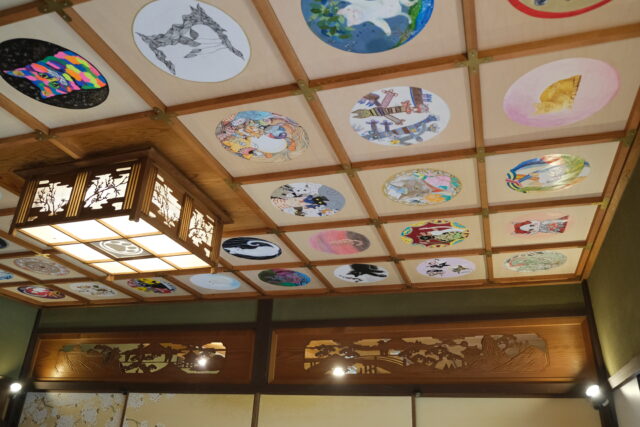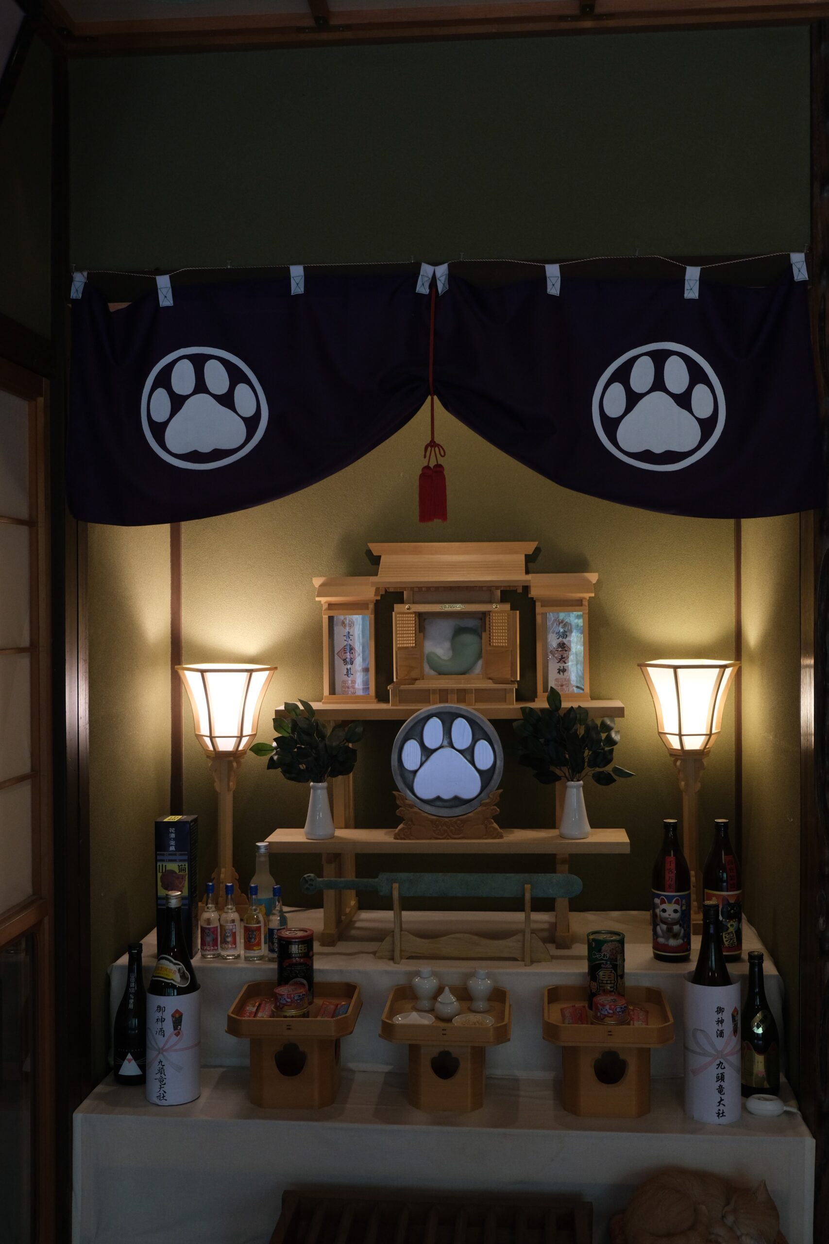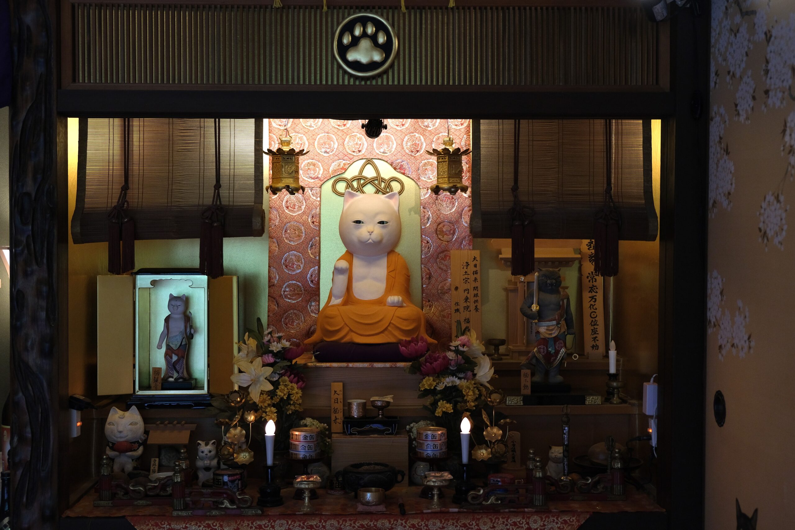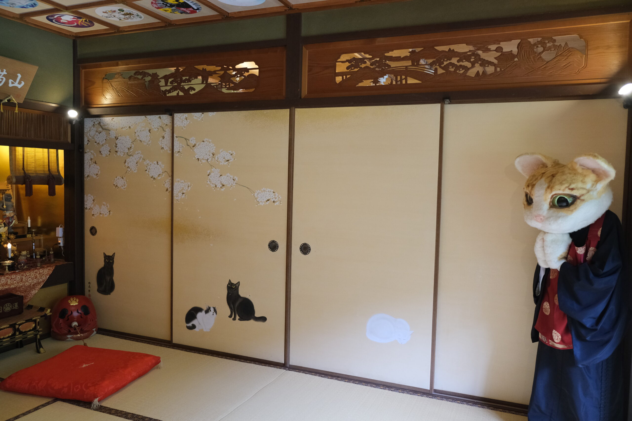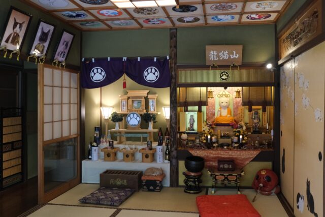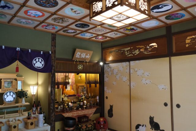 この寺のご本尊、大日猫来(だいにちにゃらい)は、開眼法要がとり行われ御魂入れされた本式の猫仏像です。また本堂左手には三種の猫器(さんしゅのにゃんぎ)があり、御祭神には素戔猫尊(すさにゃるのみこと)、猫照大神(ねこてらすおおみかみ)がお祀りされていて、九頭竜大社の神主にご祈祷いただいたそうです。天井には44名の作家によって個性あふれる猫が描かれた天井画があり、圧巻でした。