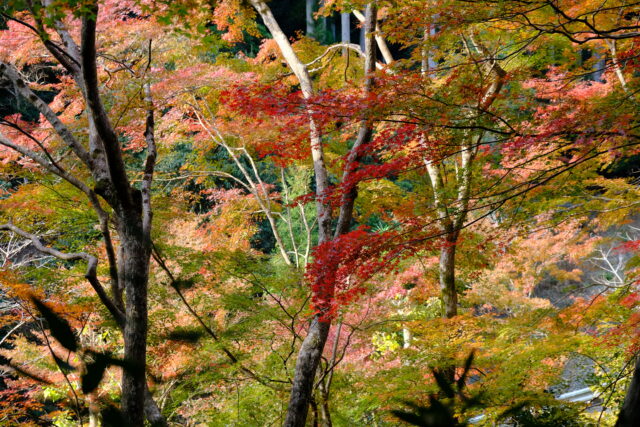 山道を登っていくと周りが突然明るくなり、燃えるような紅葉だなあと思ったら毘沙門堂でした。毘沙門堂は天台宗の門跡寺院で、開山当初(703年)は京都御所の北側にあったそうです。戦乱や焼失などを乗り越え、江戸時代(1665年)天海大僧正の尽力により現在の地に再建されました。本堂や唐門は17,18世紀の日本建築の特徴がみられます。京都では紅葉の穴場だそうです。