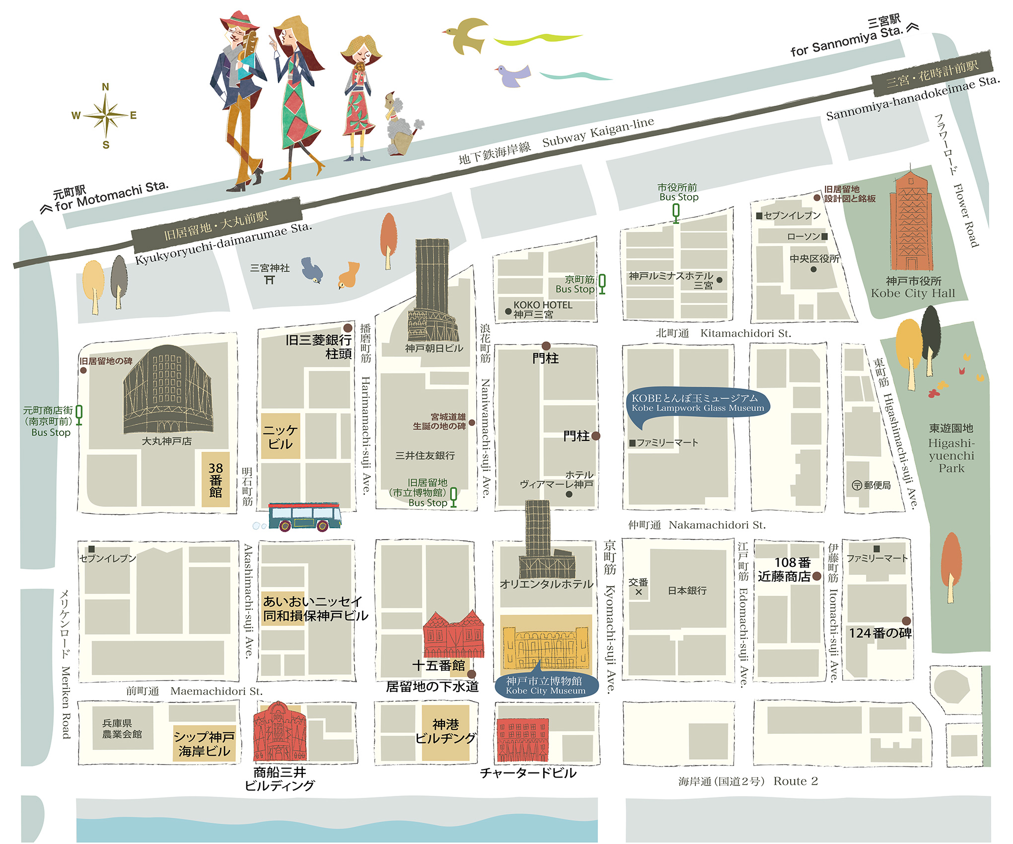 太平洋戦争で、旧居留地では建物の約70%が破壊されました。しかし、1950年の朝鮮戦争によって日本の経済が活発化され、復興が促進されました。1980年頃から近代洋風建築物と歴史的景観が見直されだし、明治時代の外国人が建てた建物を活用したブティックやカフェ、レストランなどの商業施設ができ始めました。平成7年(1995年)の阪神淡路大震災により多くのビルが破壊されましたが、震災から8年を経過した2002年には建物の9割が再建されたそうです。また、歩道の拡幅、ベンチの設置など歩行者重視の整備が現在でも進められています。