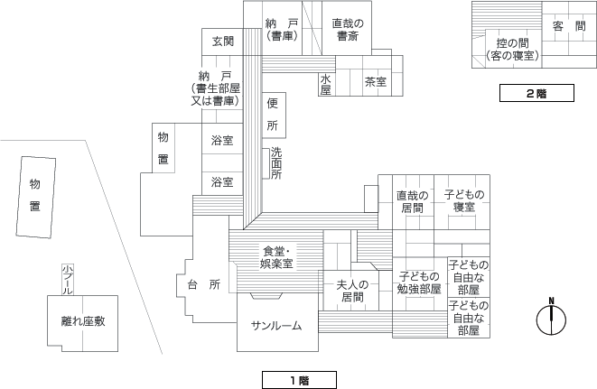 明治時代に活躍した、白樺派を代表する作家のひとりである志賀直哉は、奈良、高畑町に、自分自身が設計した木造二階建ての住宅を昭和4年に建てました。数寄屋風の造りですが、ダイニングルームやサンルームなどの洋風の様式も取り入れられています。この邸宅には当時文化人が多く集まり、芸術論を戦わせたそうです。