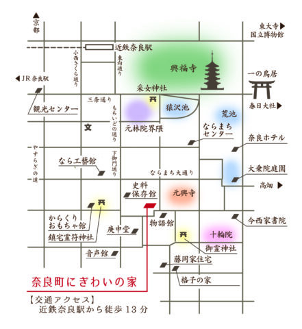奈良町物語館やにぎわいの家がある界隈はならまちの中心に位置し、周りは古い町家がいっぱいあります。菊岡漢方薬局、吉田蚊帳、元興寺西室、近田家住宅、他にもあちこちに木造の古い建物が建っていて飽きさせません。また、ならまちに行くとあちこちの家の軒先に見られる赤いぬいぐるみは、身代わり申といって、災いを代わりに受けてくれるそうです。