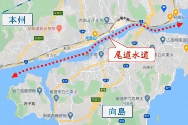 尾道は瀬戸内海に面していますが、ここから対岸の向島との間は狭く、距離は200mから300mしか離れていません。下の写真をご覧ください。向かって右側が尾道で左側が向島、間の川のような所が瀬戸内海です。そのためここは「尾道水道」とも言われます。